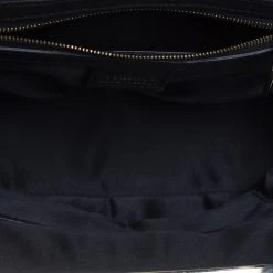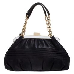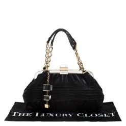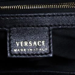 Featuring a textured exterior, this Versace satchel exudes just the right amount of luxury and style. Crafted from leather in Italy, this piece has a gold-tone framed top and an interesting charm dangling at the front. It features dual top handles and a fabric-lined interior that houses a zip pocket. Its unique shape lends it a vintage touch.