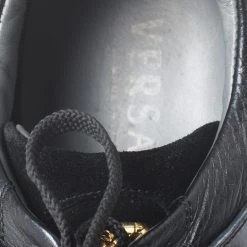 This unique pair of Versace sneakers is all you need to look smart and stylish. They are crafted from black leather in a low top silhouette with gold-tone plates as well as lace-ups on the vamps. The rubber sole on these sneakers ensures durability.