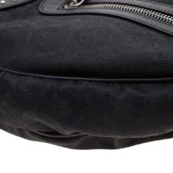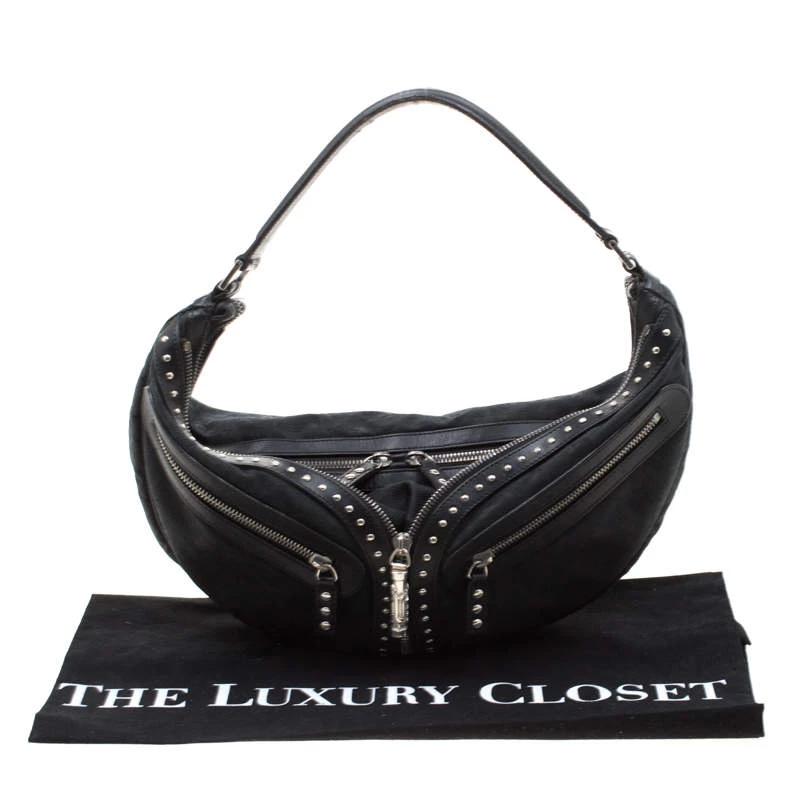 This black hobo by Versace is just what you need to create an edgy, chic look. Made from printed canvas and leather trim, it is detailed with silver-tone studs and multiple zippers and pockets to create the bold look. The interior is lined with black satin and features a zip pocket.