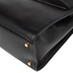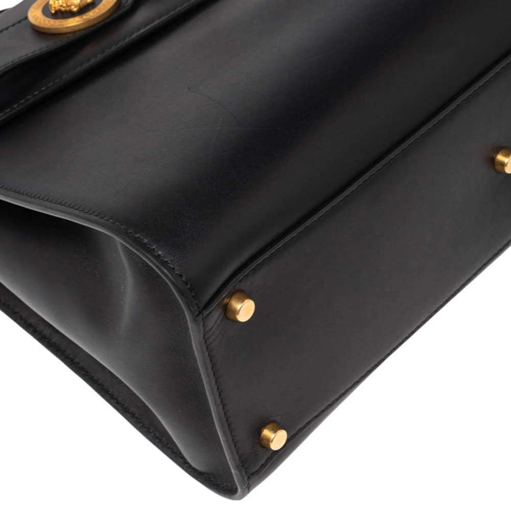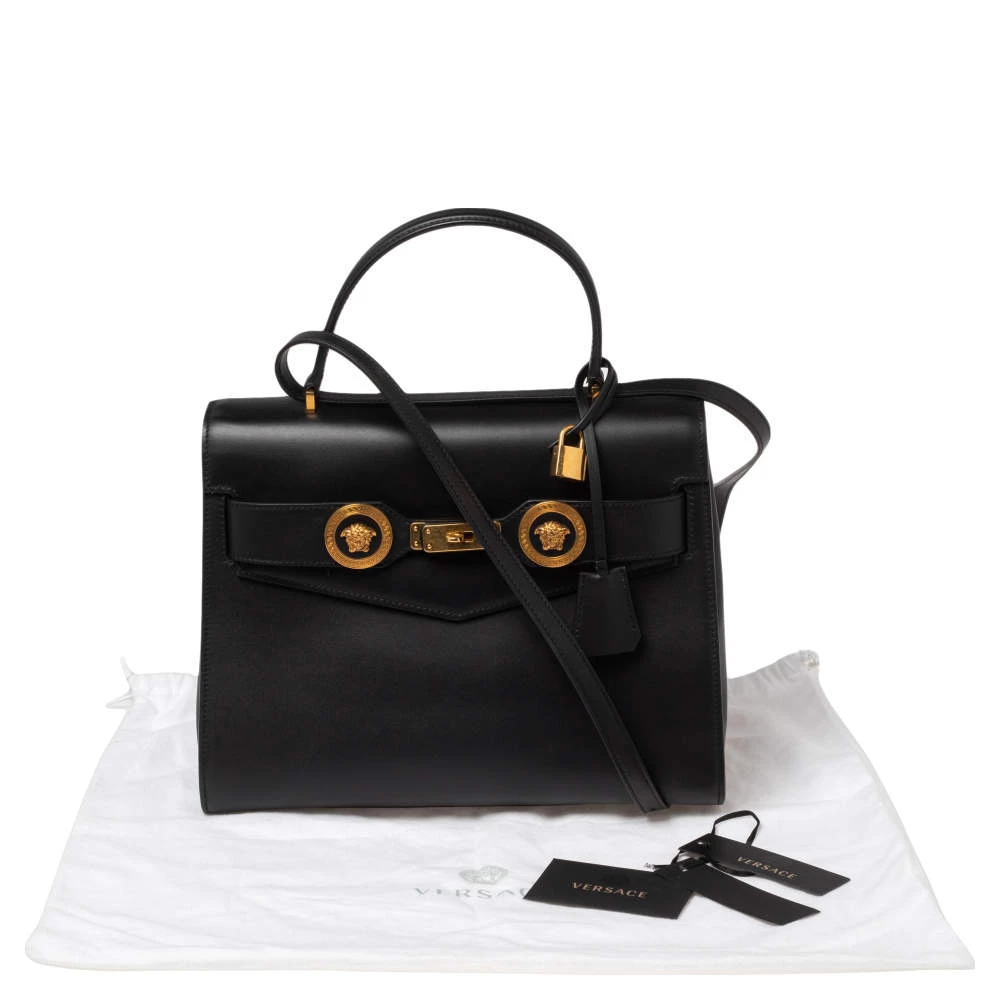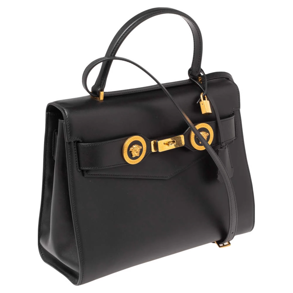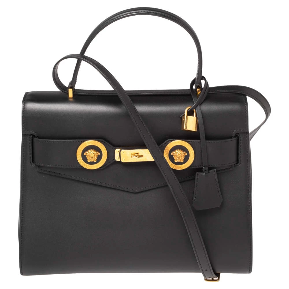 Make a striking appearance with this fashionable bag by Versace. This elegant creation is at once a fashion statement as well as a rational necessity. It is crafted from leather and is adorned with gold-tone signature Medusa motifs and a turn lock. Lined with leather, it has a spacious interior where you can stow your basics. This pretty piece is complete with a top handle and a strap.