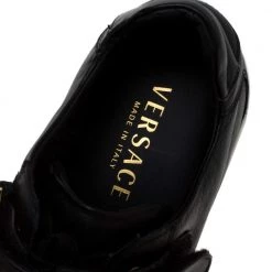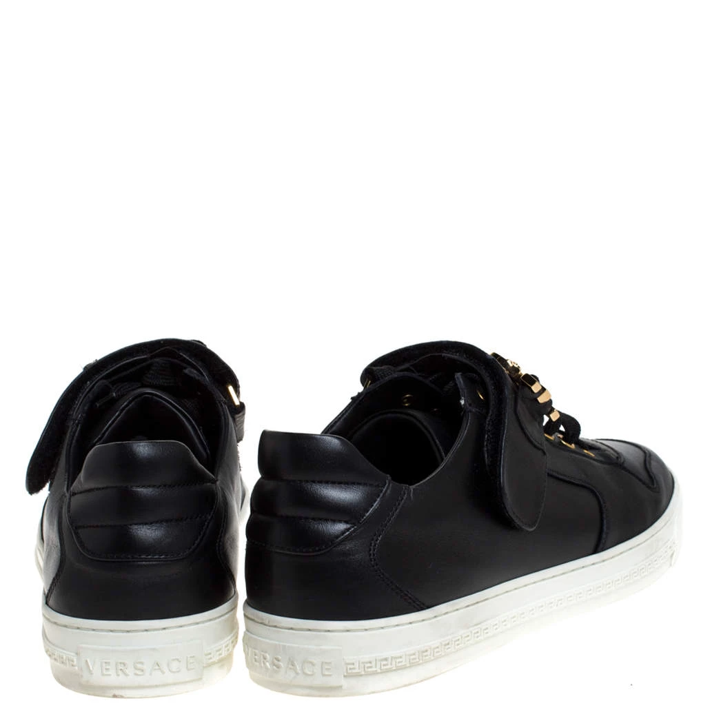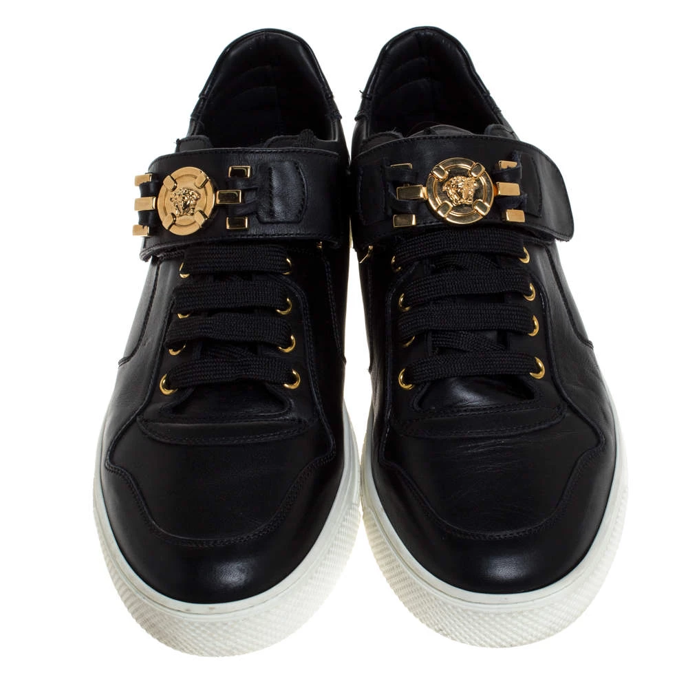 These leather sneakers are the epitome of versatility, meant to lend a luxe twist to your outfit. Looking fashionable in your casuals is as easy as slipping in these gorgeous black sneakers. Designed by Versace, they feature the Medusa detail, lace-up vamps and velcro straps.