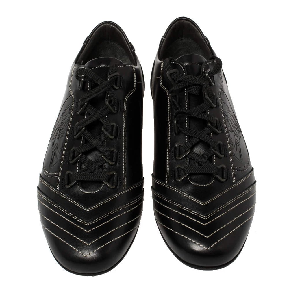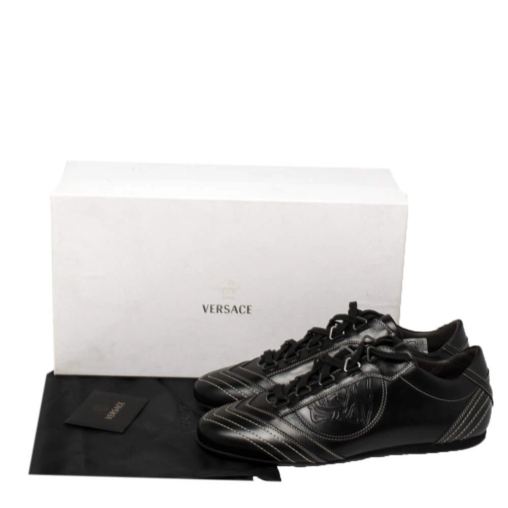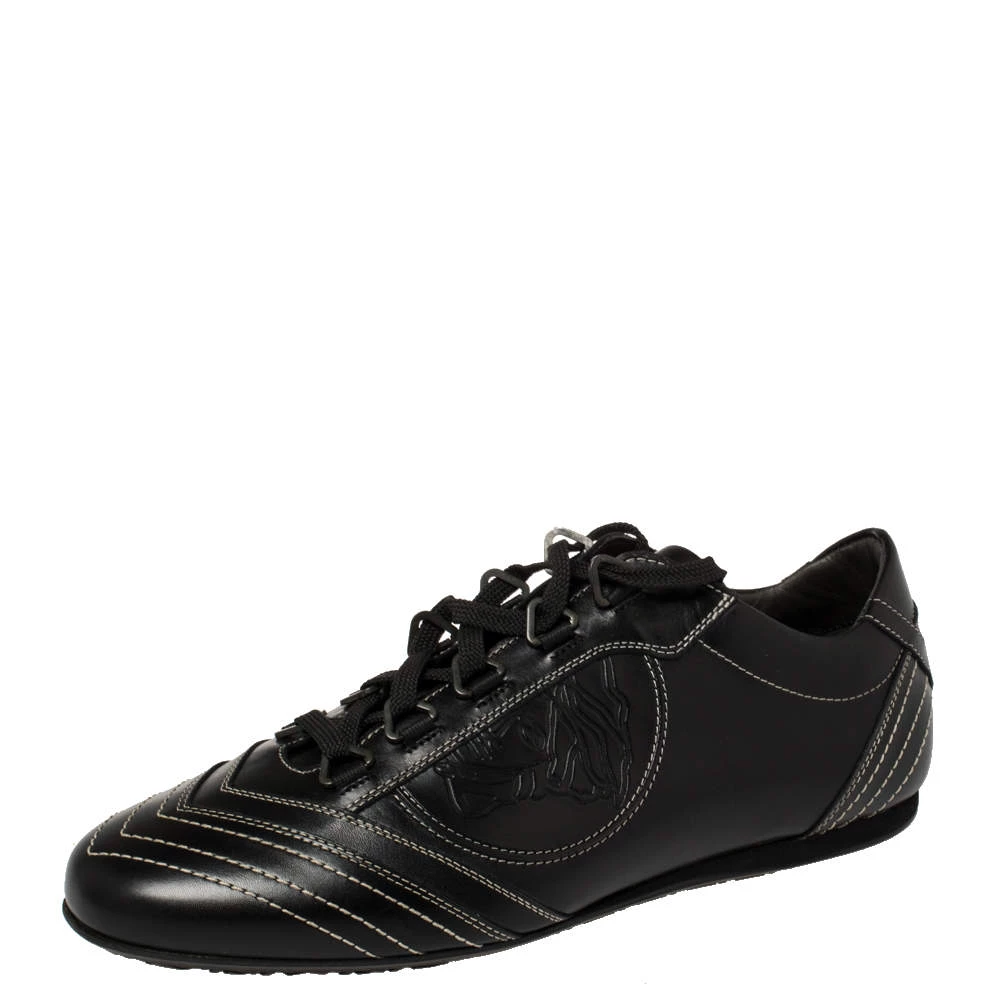 Elevate your style quotient with these trendy and chic sneakers from Versace! These low-top sneakers are crafted from black leather and styled with round toes, contrasting stitches, lace-ups on the vamps, and the signature Medusa logo detailing on the sides. They are complete with leather-lined comfortable insoles and durable rubber soles.