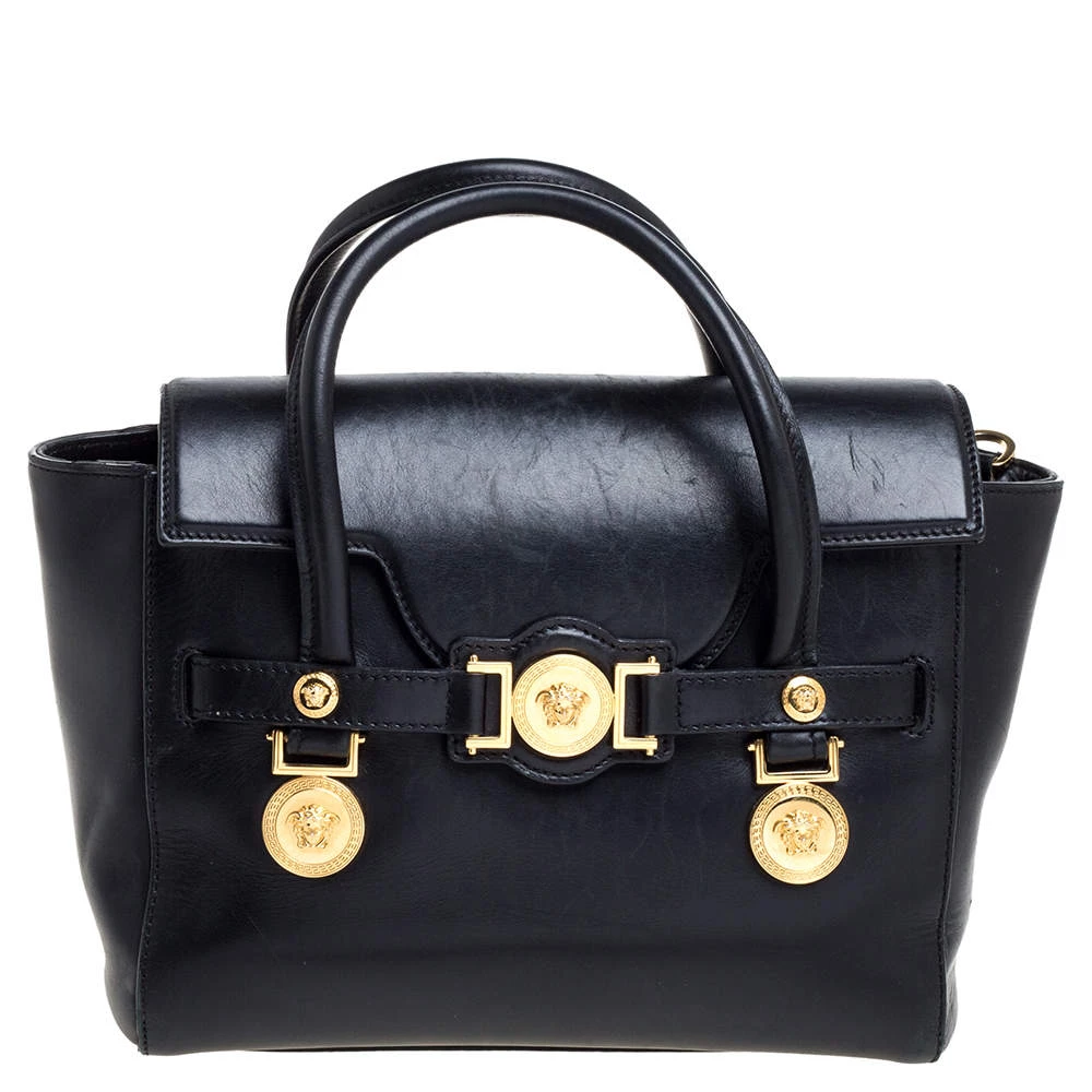 Sophisticated and luxe, this bag from Versace definitely needs to be on your wishlist. The bag is crafted from leather in a black shade and it features a structured silhouette. It flaunts dual handles, a removable shoulder strap, and the famous Medusa logo on the front. The spacious fabric interior houses pockets.
