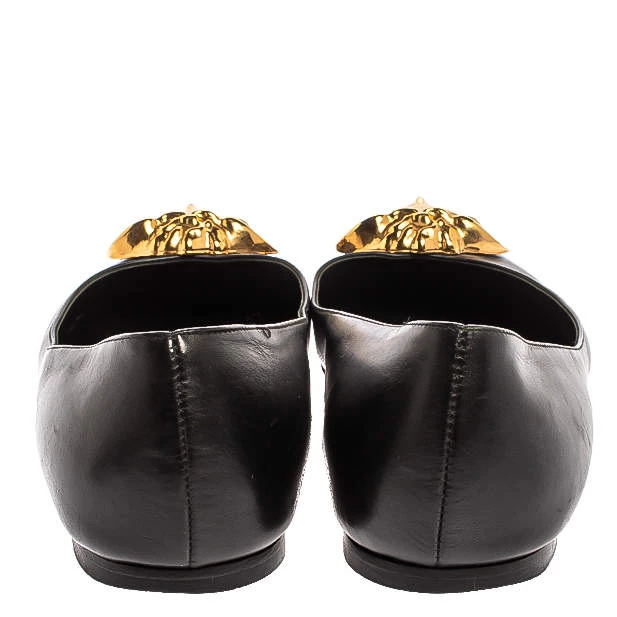 This pair of Versace ballet flats are a style statement with a timeless design. Crafted from black leather, they feature pointed toes accented with the iconic Medusa motif in gold-tone metal and leather soles. They bring a touch of glamour to every outfit they are paired with.