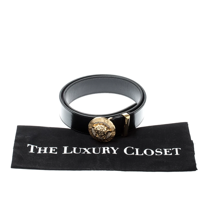 Accessorise right with this belt from Versace. It is made from classic black leather and has a sleek design with a gold-tone metal Medusa buckle at the front.