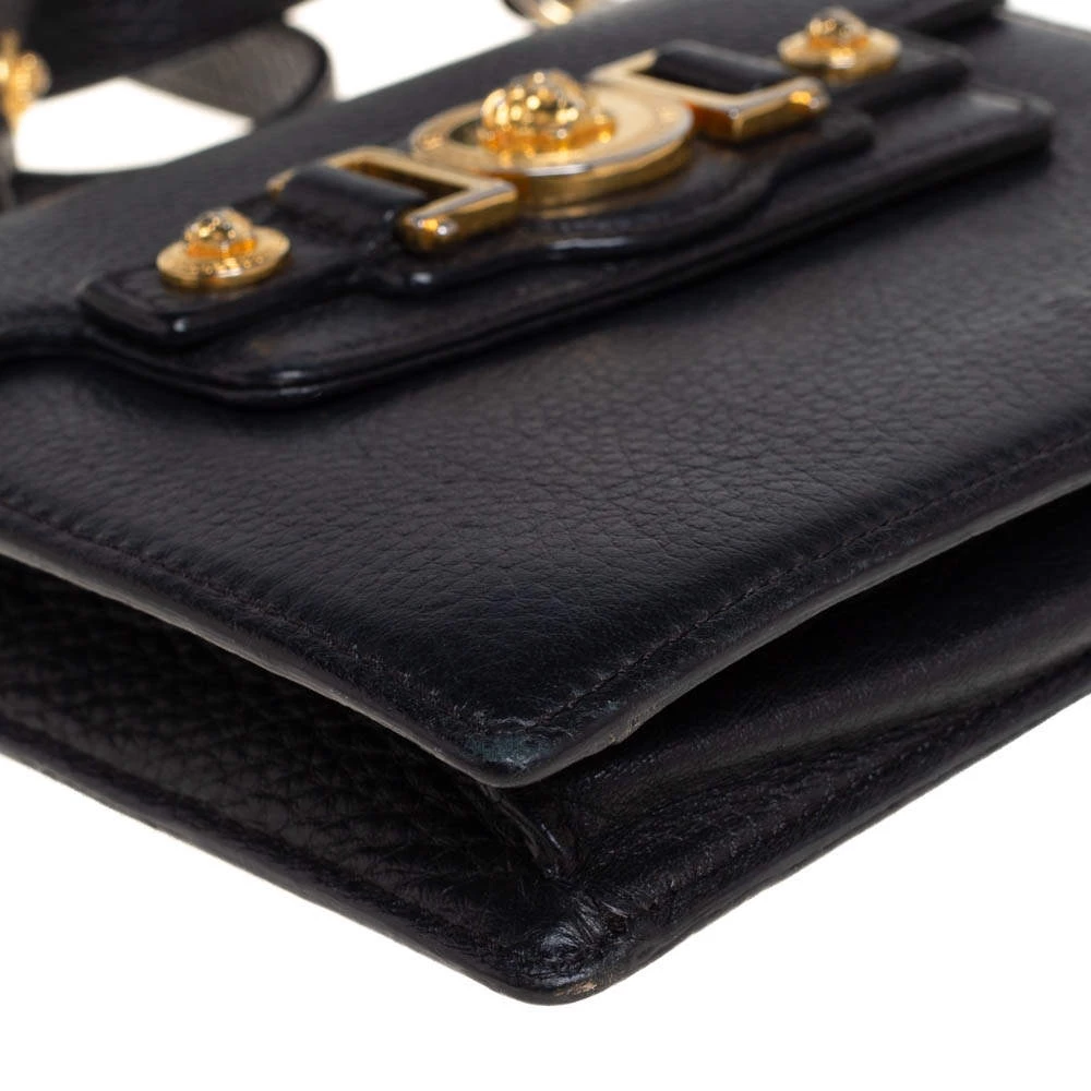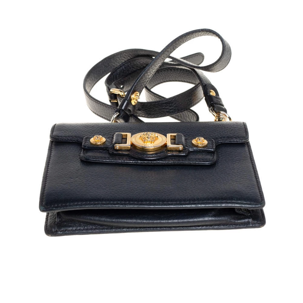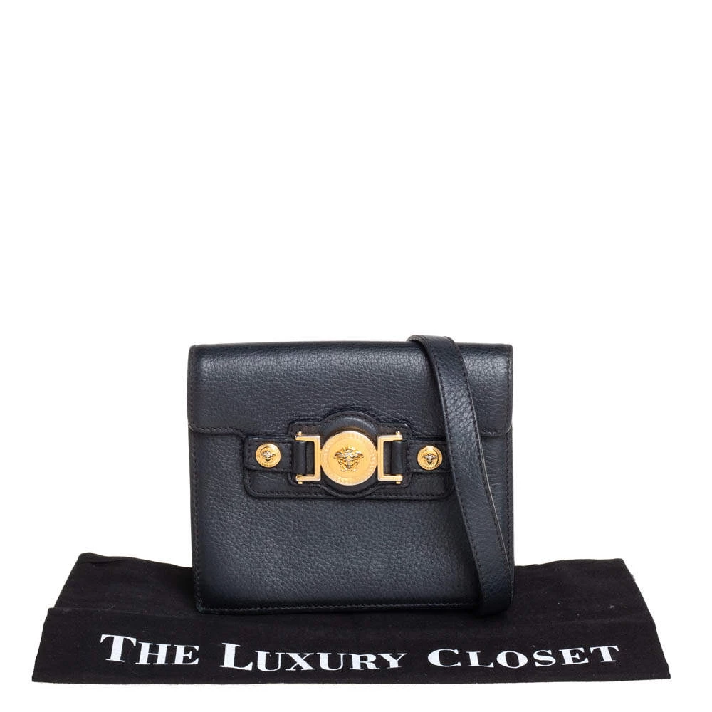 This bag from Versace is designed in a black leather body. It brings a Medusa-adorned strap on the front flap. The flap opens to a satin-lined interior that’s sized to easily hold your essentials. It comes held by a single crossbody strap.
