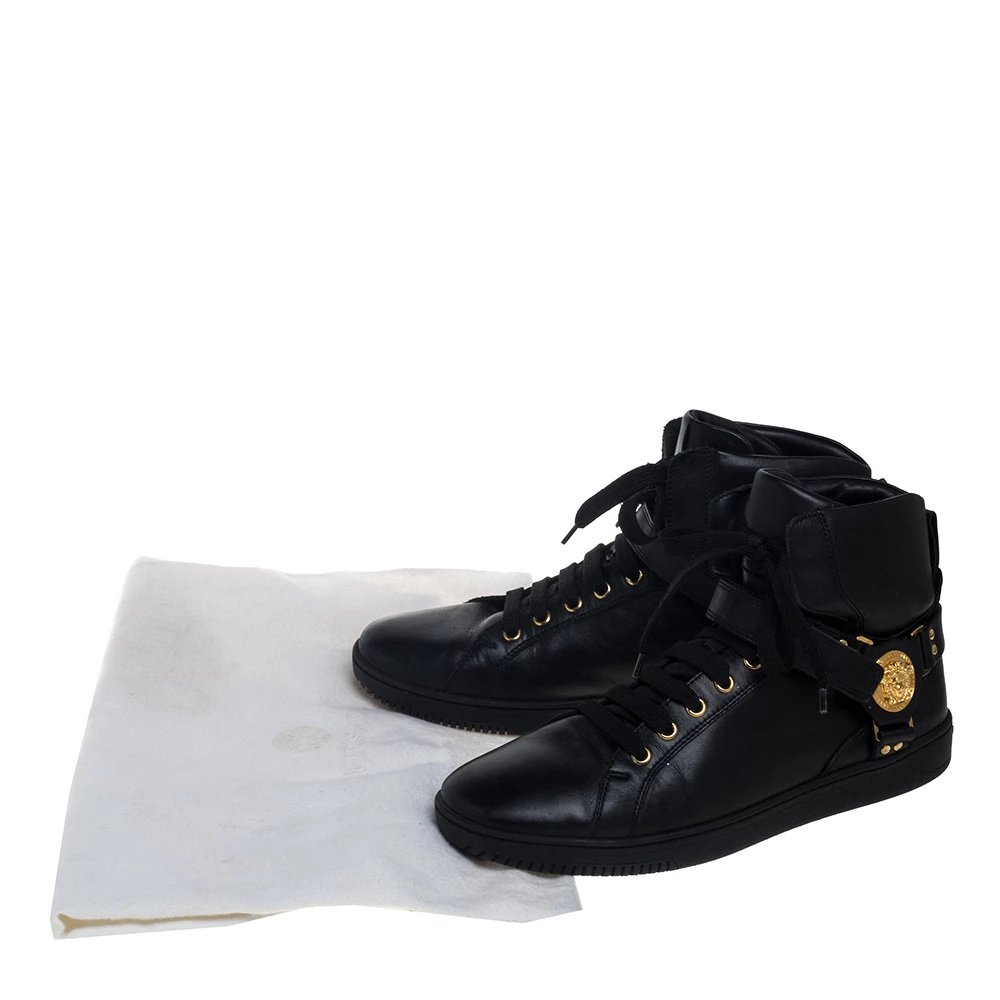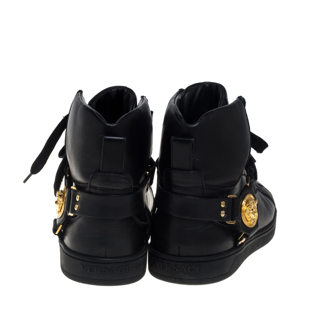 Brimming with luxe details, these Versace sneakers are crafted from leather into a high-top silhouette and feature lace-up vamps, gold-tone hardware, and the Medusa logo. Comfortable soles and a trendy appeal make these sneakers a must-buy.