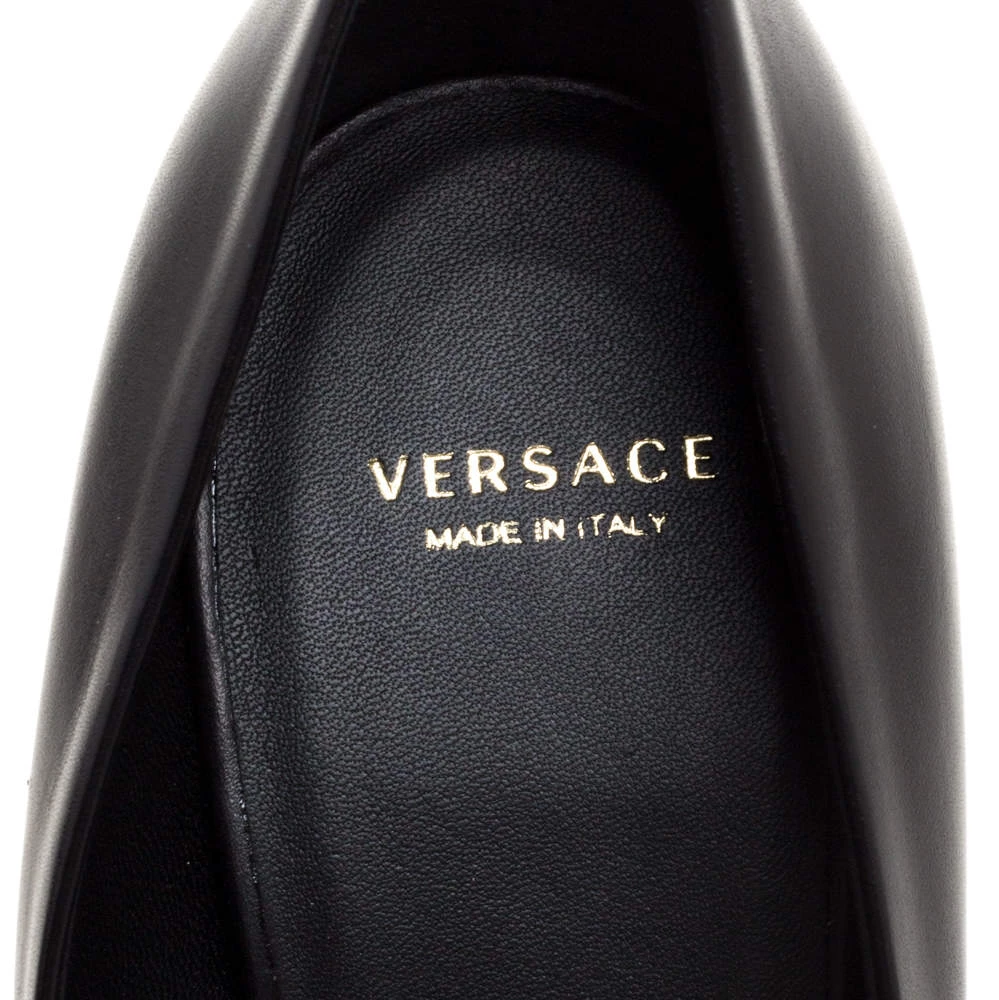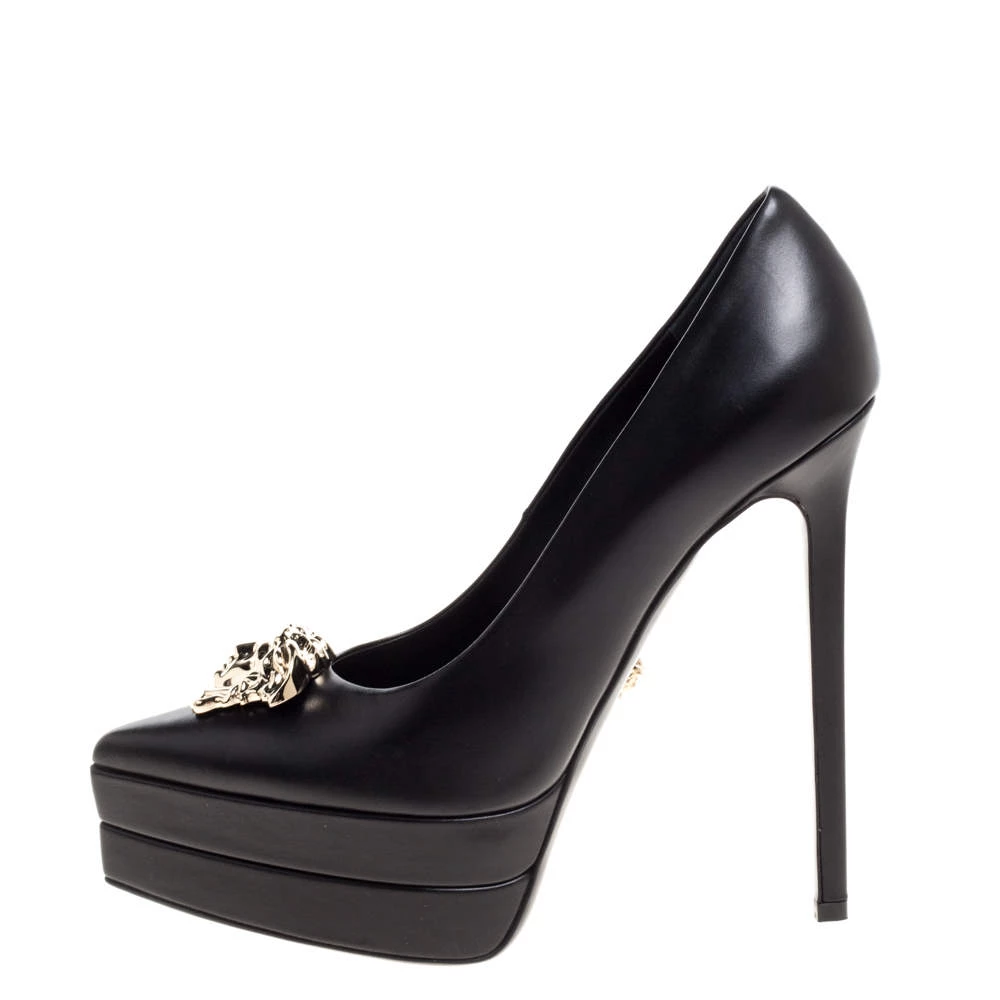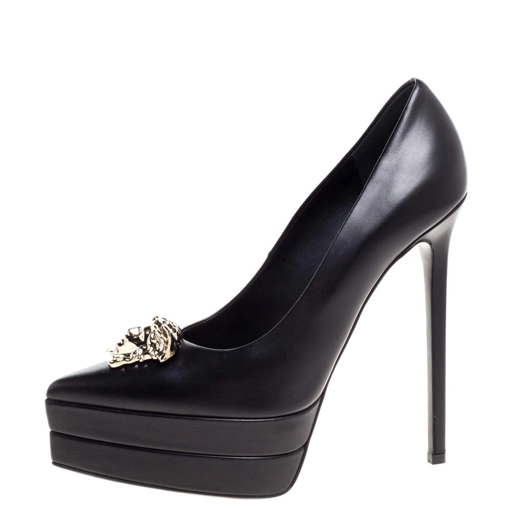 Designed to perfection, these pointed-toe pumps are from the luxury house of Versace. They are covered in leather, detailed with the Medusa logo and balanced on 15 cm heels and platforms. Feel your best every time you slip into these black pumps.
