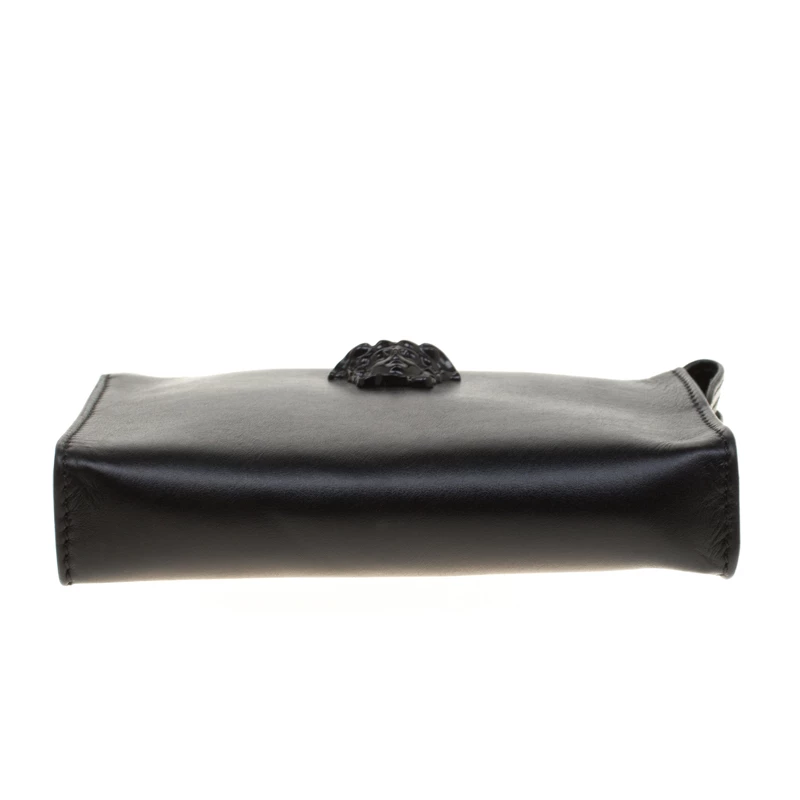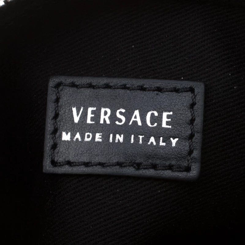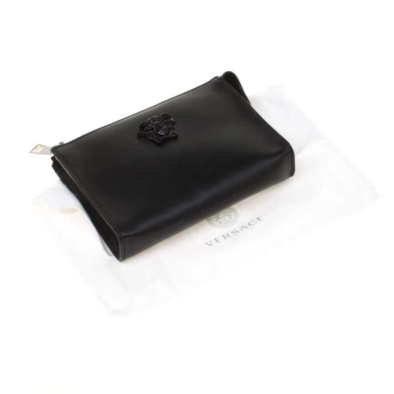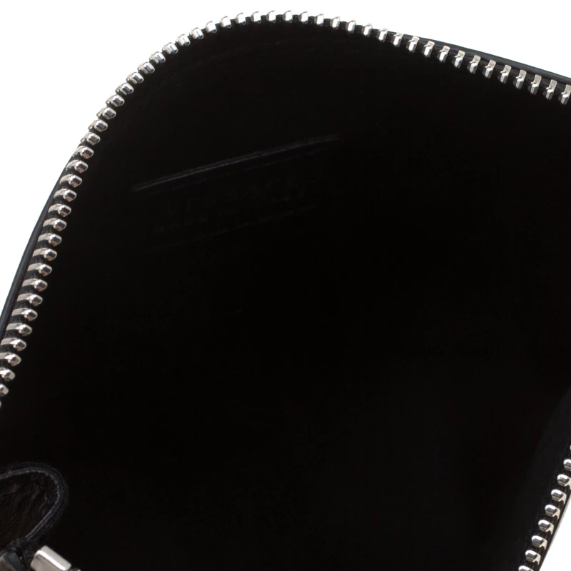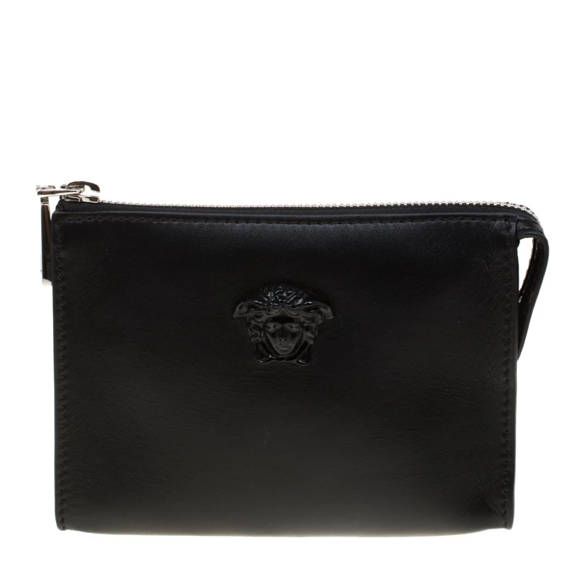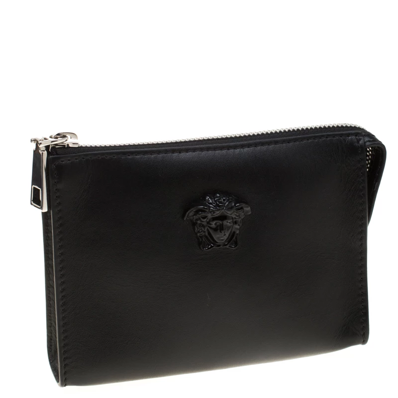 Finely crafted from leather, this Versace pochette is a worthy buy! The piece features the Medusa emblem on the front and a fabric interior secured by a zipper. This pochette is handy and stylish.