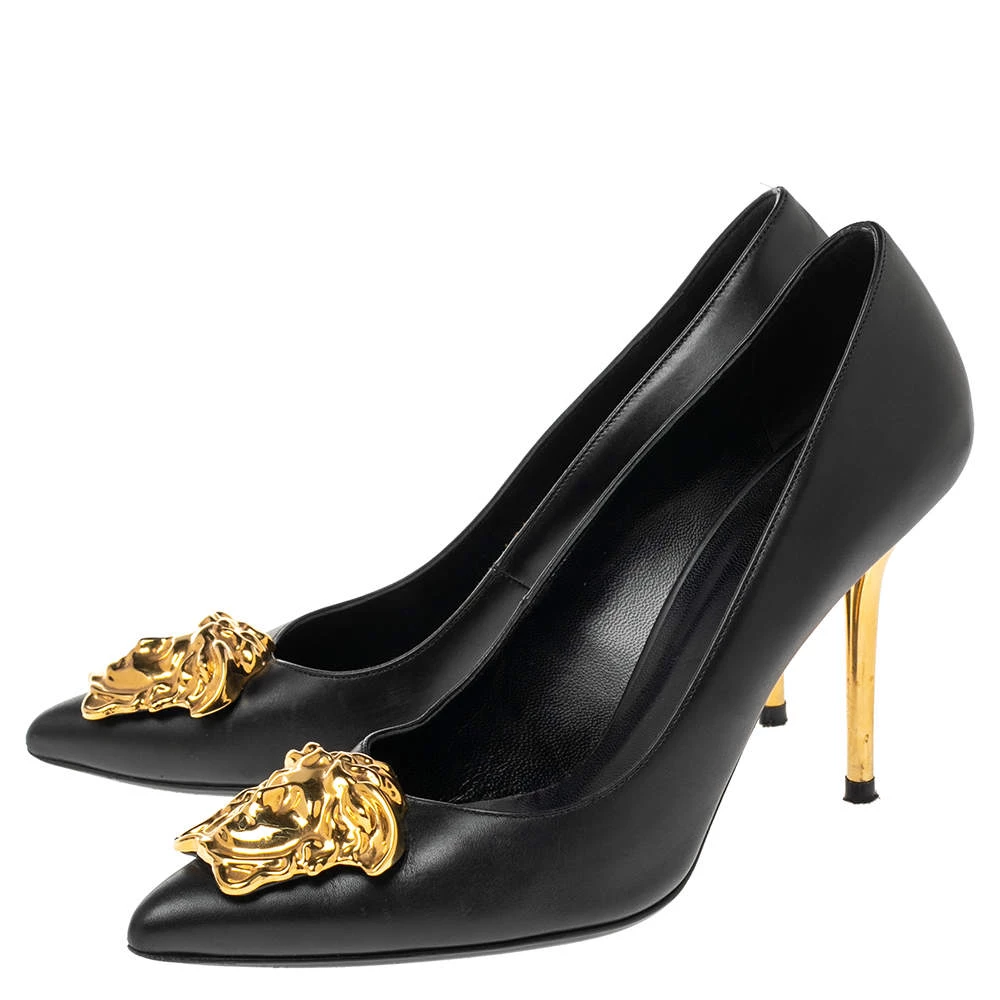 This pair of Versace pumps are a style statement with a timeless design. Crafted from black leather, they feature pointed toes accented with the iconic Medusa motif in gold-tone metal, 10 cm heels, and leather soles. They bring a touch of glamour to every outfit they are paired with.