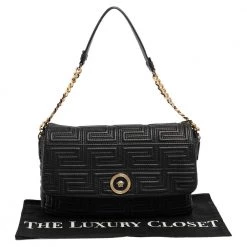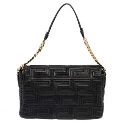 Make a striking appearance with this fashionable shoulder bag by Versace. This elegant creation is at once a fashion statement as well as a necessity. It is crafted from leather exhibiting the Greca motif embossed on the exterior and is adorned with a signature Medusa emblem. Lined with fabric, it has a spacious interior where you can stow your basics. This pretty piece is complete with a chainlink handle.