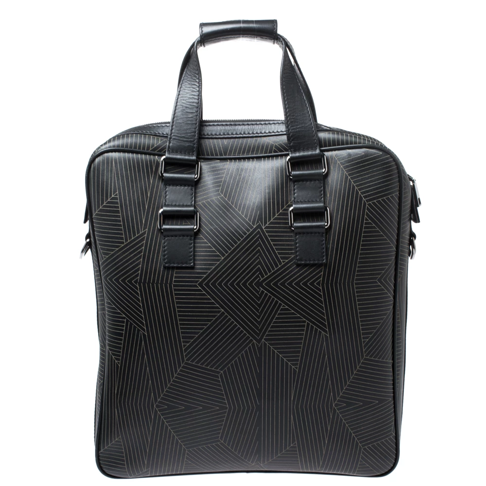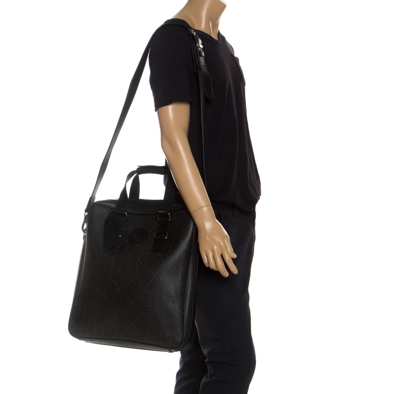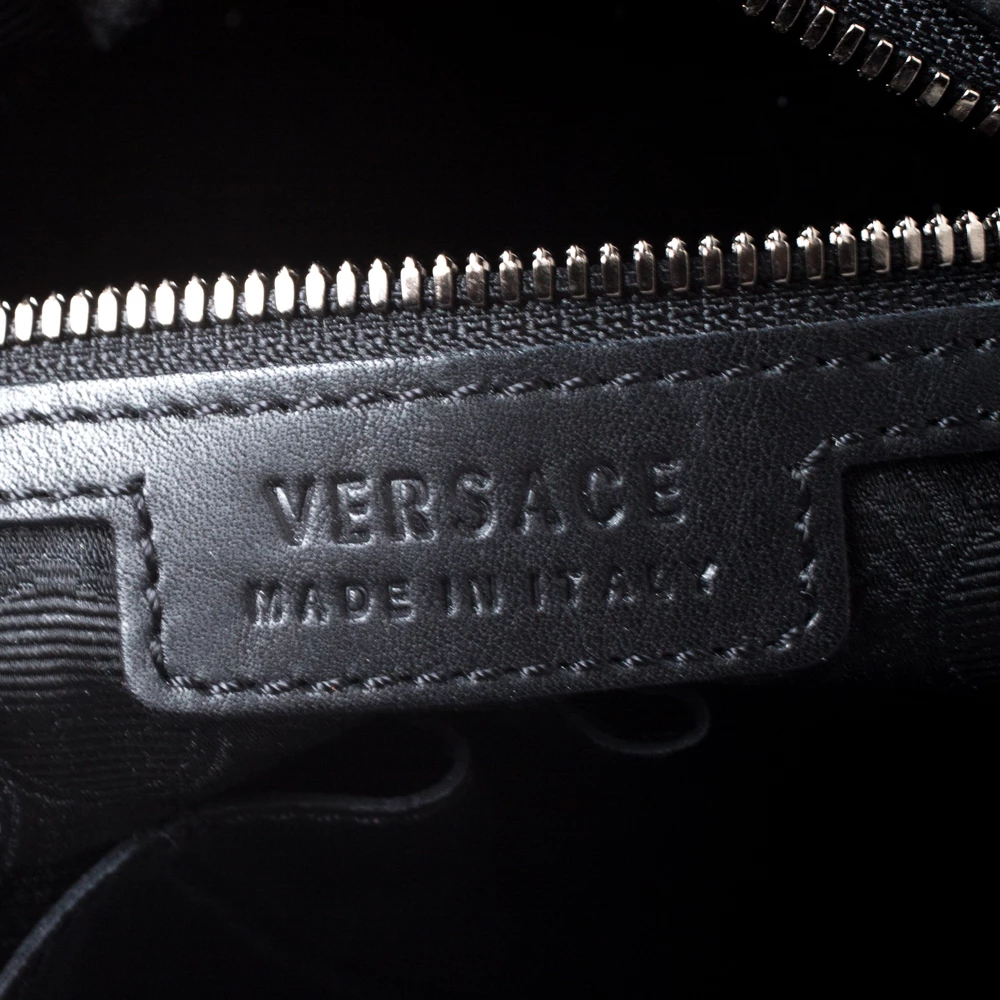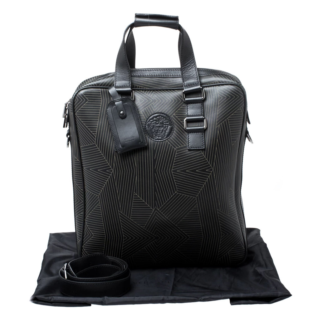 This stunning briefcase tote will elevate your everyday look instantly. Designed to deliver style and functionality, this creation from Versace is a must-have. It is has been crafted in Italy and is made of black leather. It features a lovely pattern on the exterior which is further enhanced with the signature Medusa logo. It is held by dual handles, a shoulder strap. It features a top-zip closure that opens to a fabric-lined interior with a zip pocket, patch pockets and enough space to carry all your essentials. The creation is finished with silver-tone hardware.