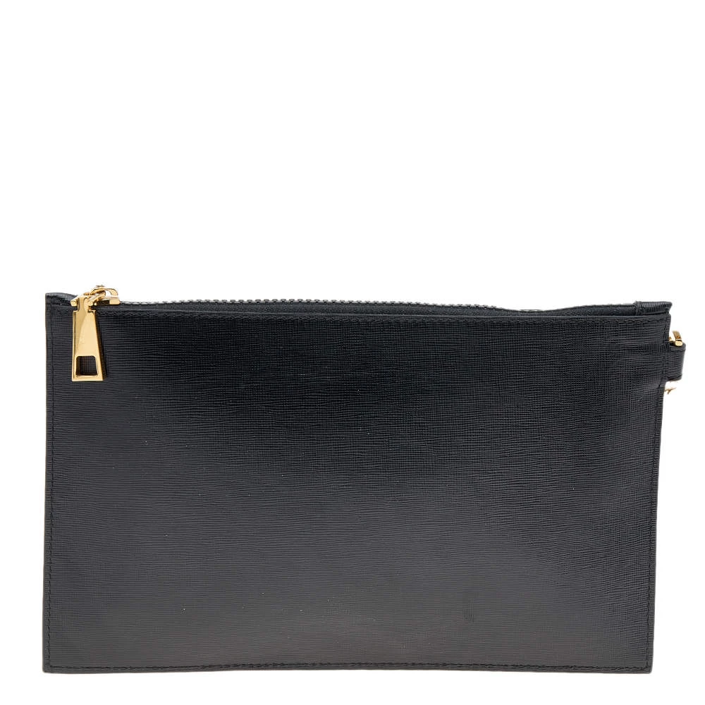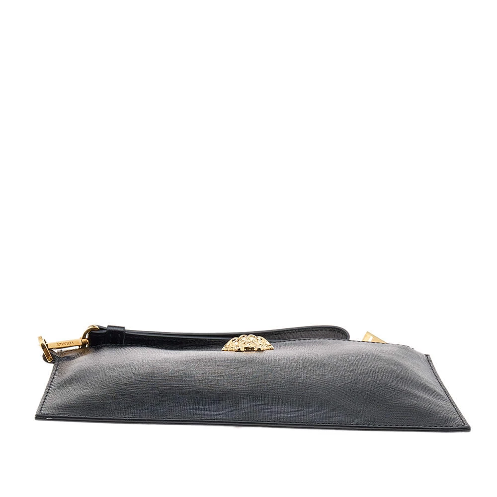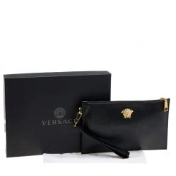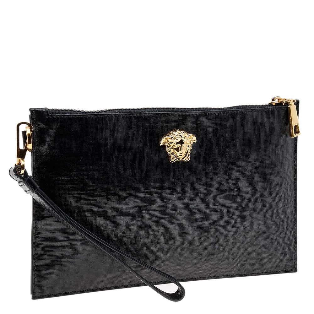 Organize your essentials in style with this Versace creation. The zip clutch has a textured leather outer in black with the Medusa motif in gold-tone metal at the front. It is lined with fabric.