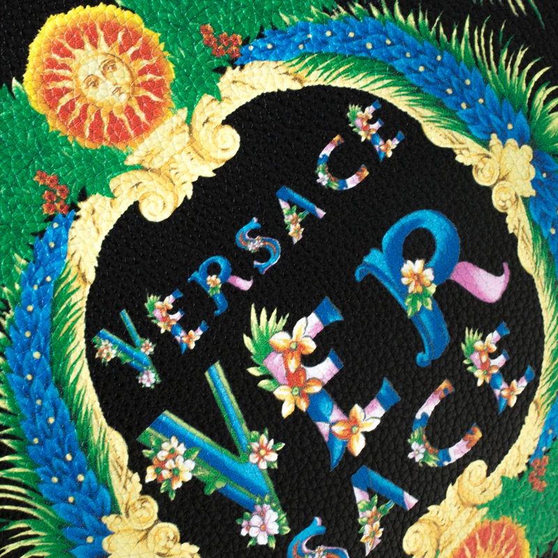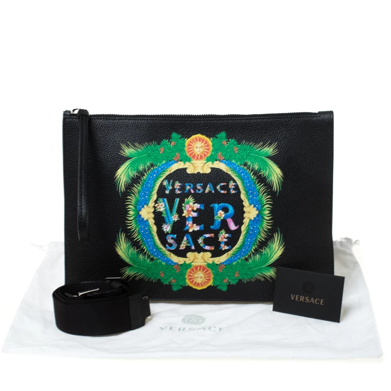 Our eyes are hooked on this gorgeous clutch from the house of Versace. Strike a balance between femininity and boldness with this black leather clutch that comes with a shoulder strap. The zip-top closure opens to a nylon lined interior and the clutch flaunts a print on the front.