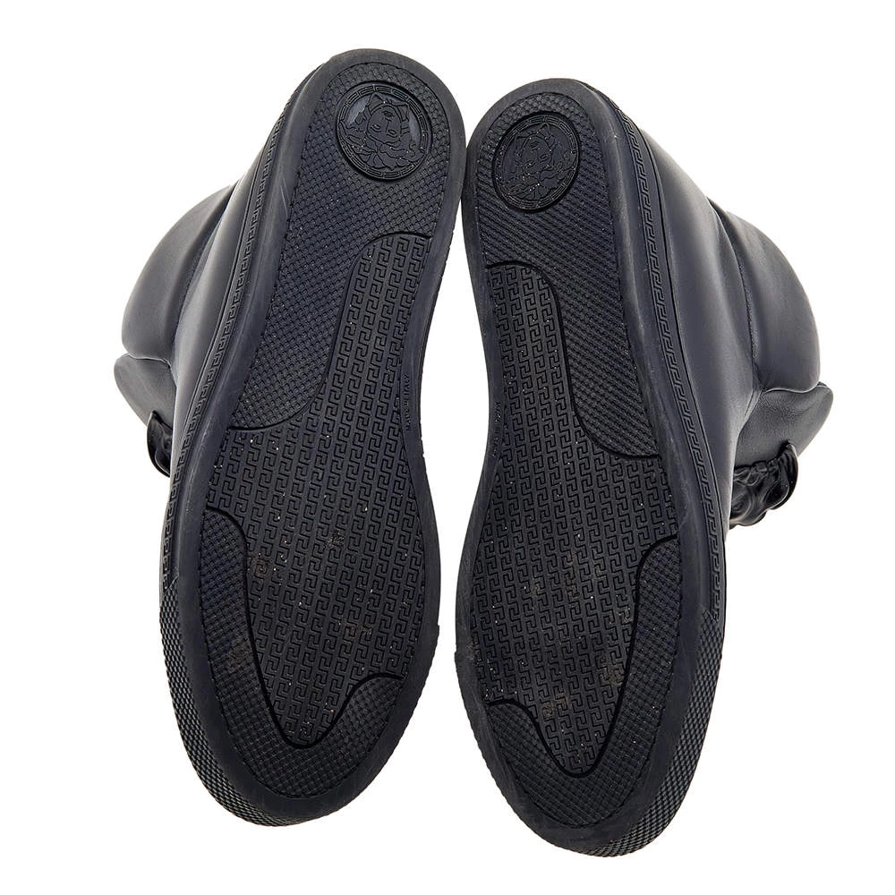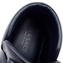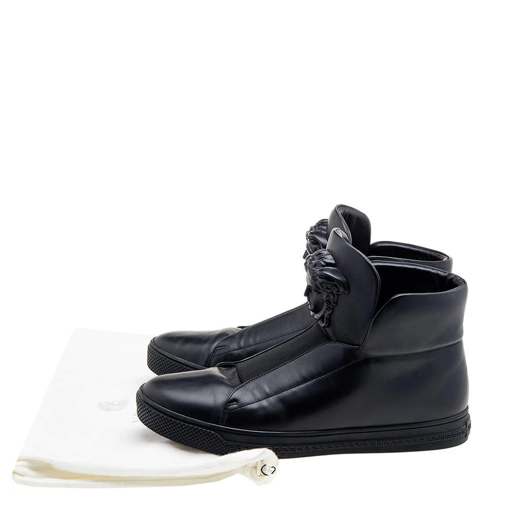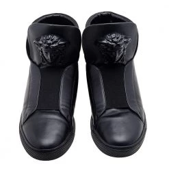 Sneakers are sought-after for reasons like comfort, ease, and casual style. These sneakers from Versace are the perfect alternative to feel comfortable. They are crafted using black leather into a high-top silhouette. They are adorned with a Medusa motif and black-tone hardware. Add them to your collection now.
