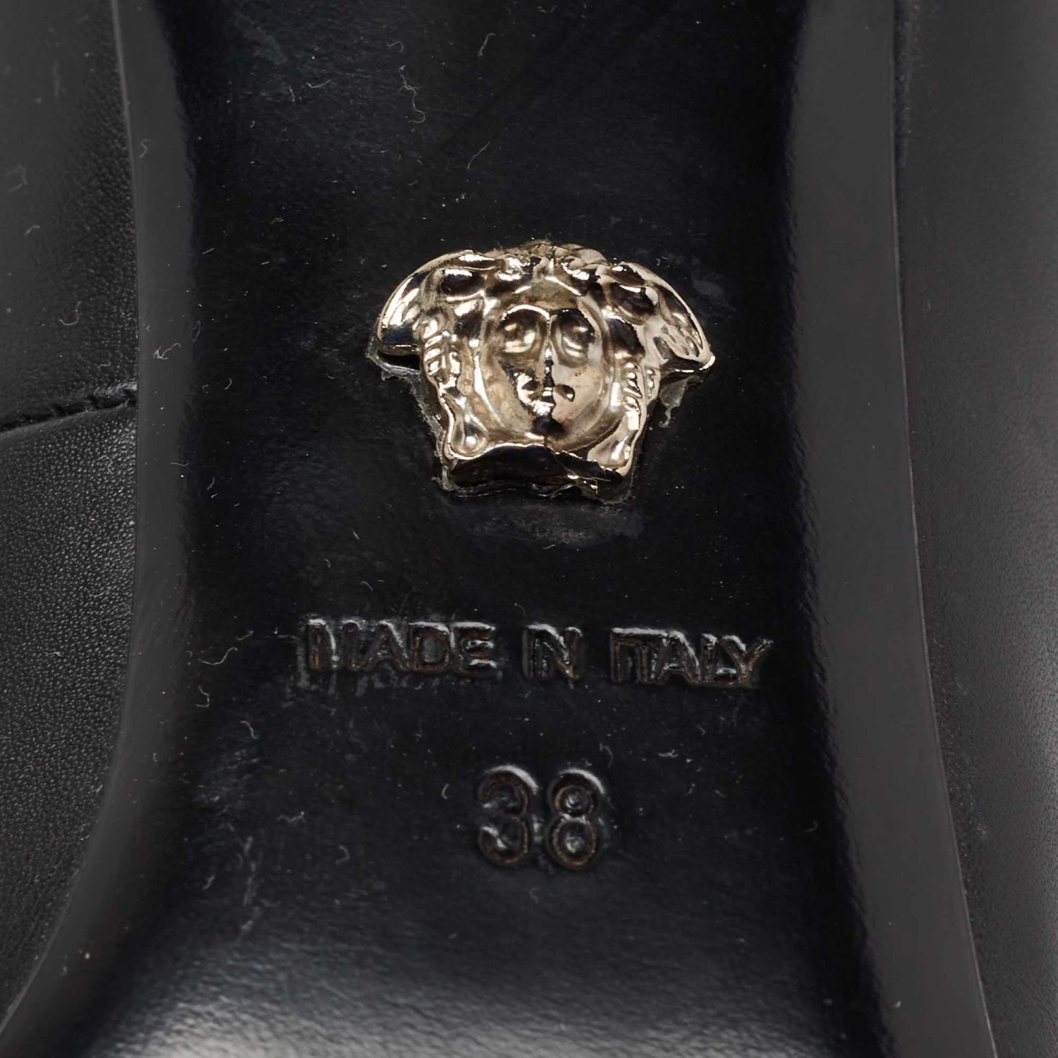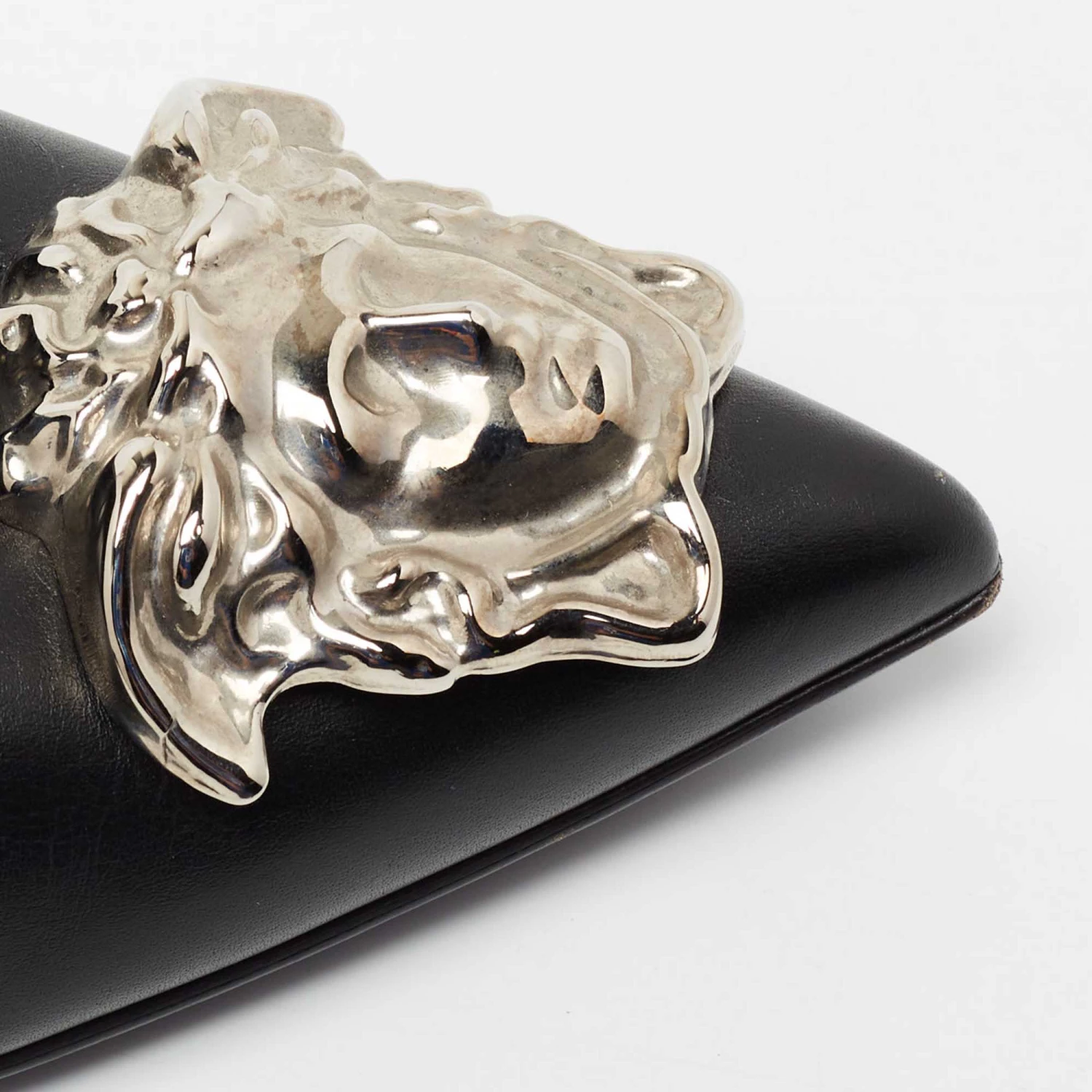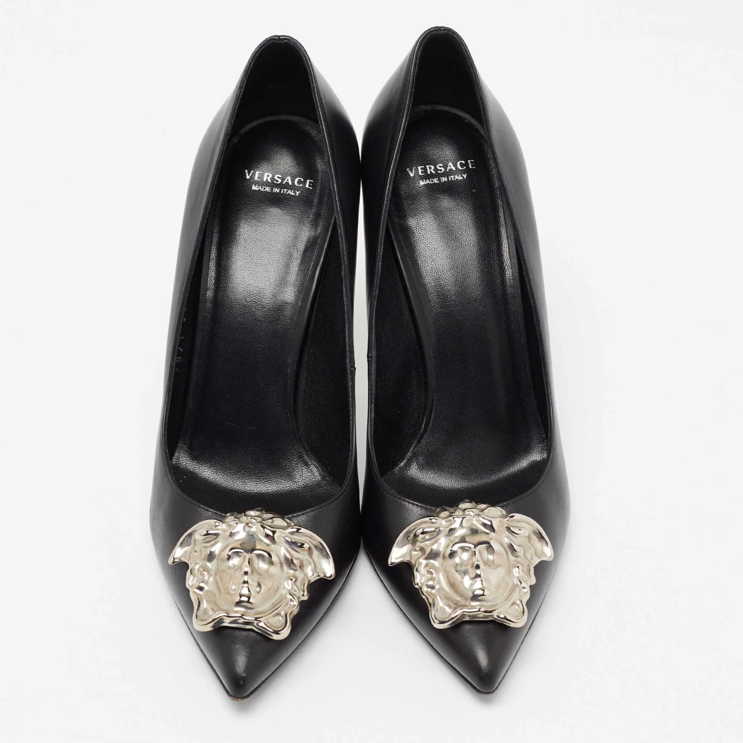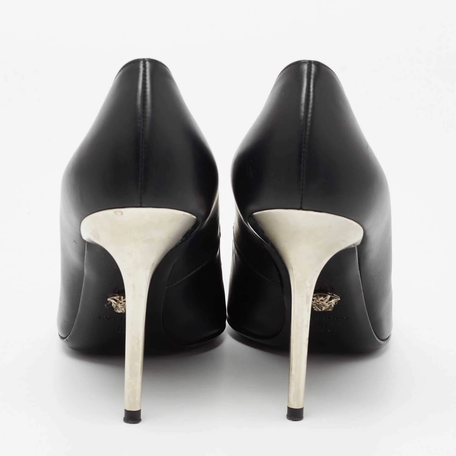Bring signature charm and skill to your feet with these beautiful pumps from the House of Versace. They are decorated with a silver-tone Medusa Head motif on the black leather exterior. They showcase pointed toes, a slip-on style, and 10 cm heels. Pair them with your attire for a classy touch.