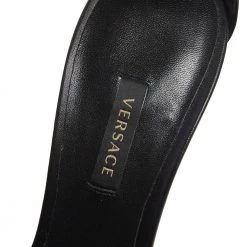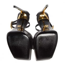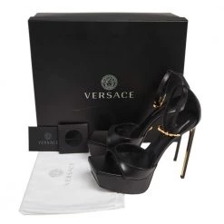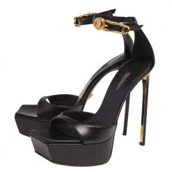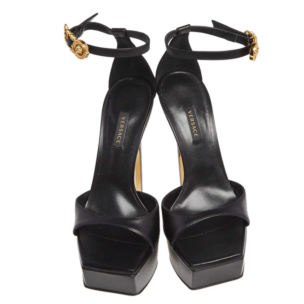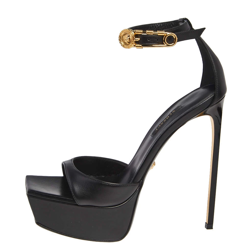 Finely crafted leather, these Versace sandals come ready to give you a high-fashion experience. They bring a design of platforms, pin buckle ankle fastenings and 14.5 cm heels. This black pair will blend well with your outfits.