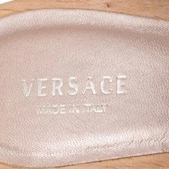 Comfort and style come together to define this pair of slide sandals from Versace. Crafted from leather, the open-toe platform slides have been designed with 11 cm heels and gold-tone signature accents on the vamps.