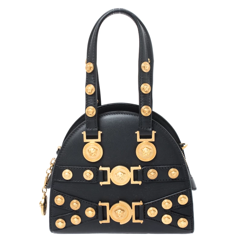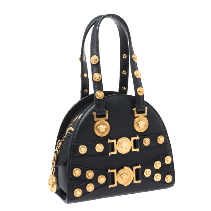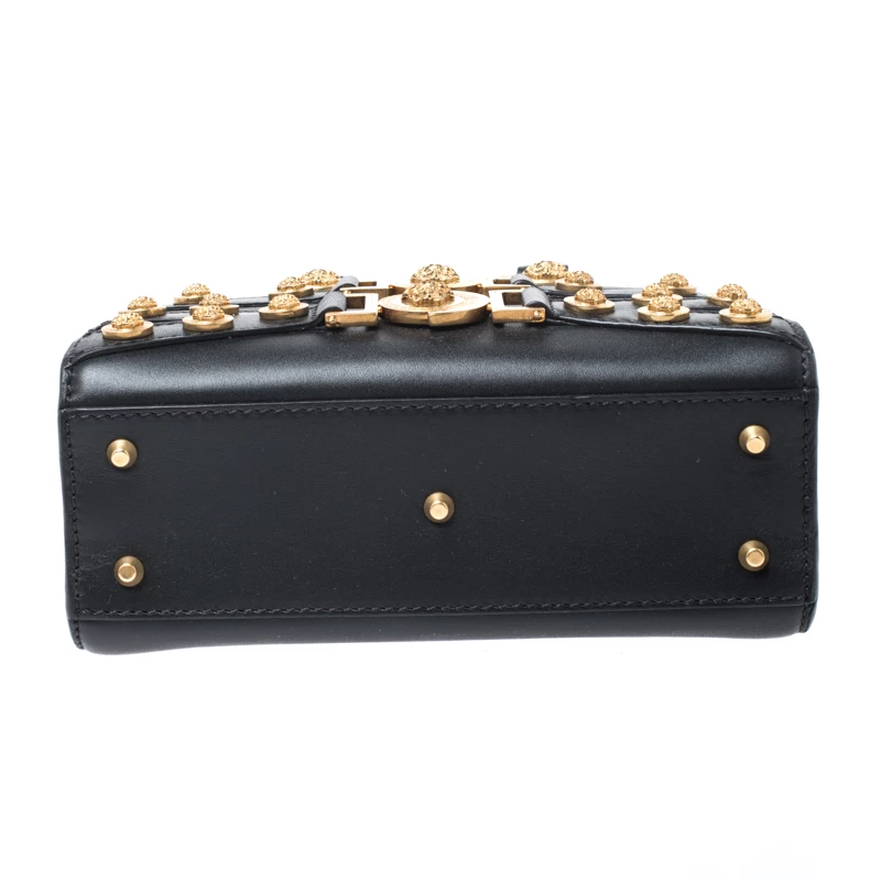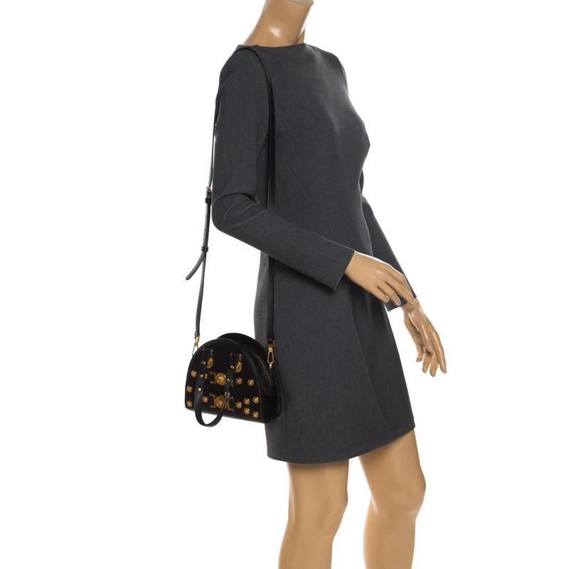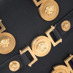 This Versace Tribute Medallion bag is one of a kind and a complete must-have. Crafted meticulously in Italy, it is made of quality leather and comes in a classic shade of black. Exuding elegance and glamour, the front exterior is adorned with gold-tone medallions that carry the signature Medusa motif. It is held by dual handles and comes with a zip closure that leads to a spacious leather interior. It is finished with protective metal feet, a detachable shoulder strap and gold-tone hardware.