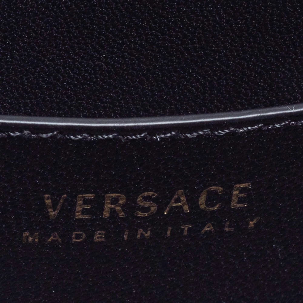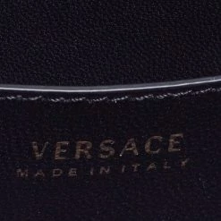 Refresh your closet with this covetable Versace bag. The pretty V logo in gold-tone hardware on the black leather base is the winning feature of this bag. Equipped with a flap and a shoulder strap, it has a leather-lined interior for the things you need.