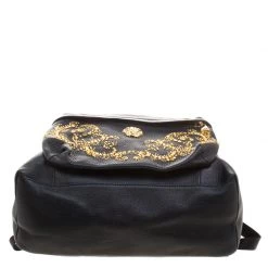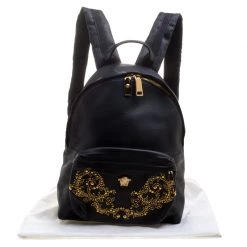 Get set to look uber stylish with this black backpack from Versace. Crafted from leather, it flaunts double zippers that reveal a spacious satin-lined interior, a zip pocket on the front and shoulder straps. Lastly, the bag is complete with stud detailing and the Medusa emblem on the front. This piece is very much in vogue, so get your hands on this today!