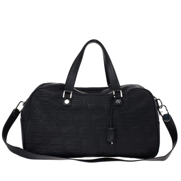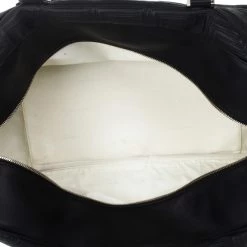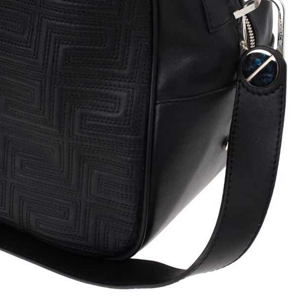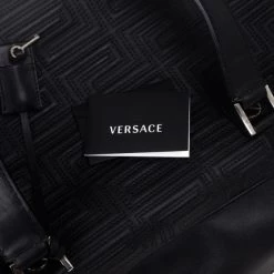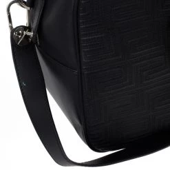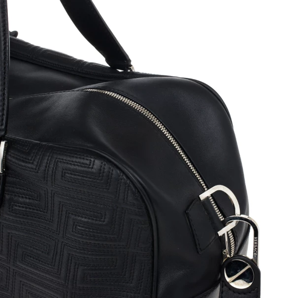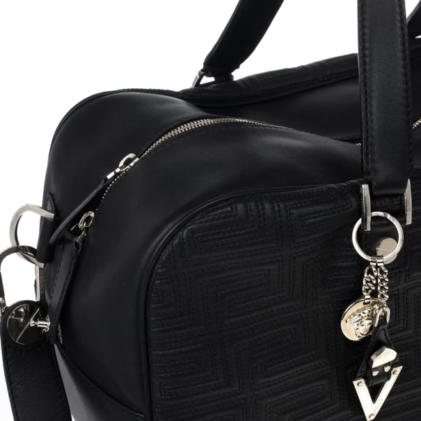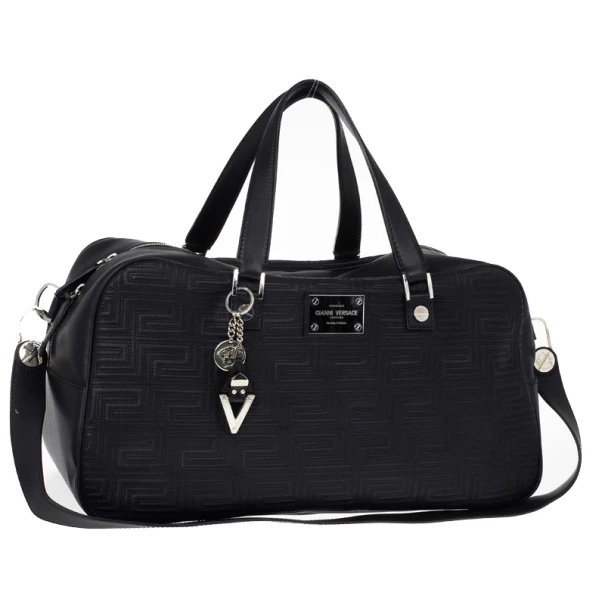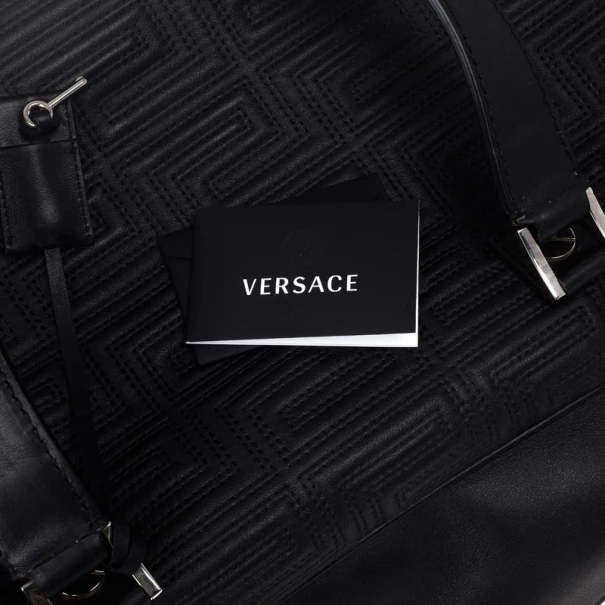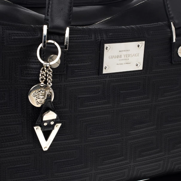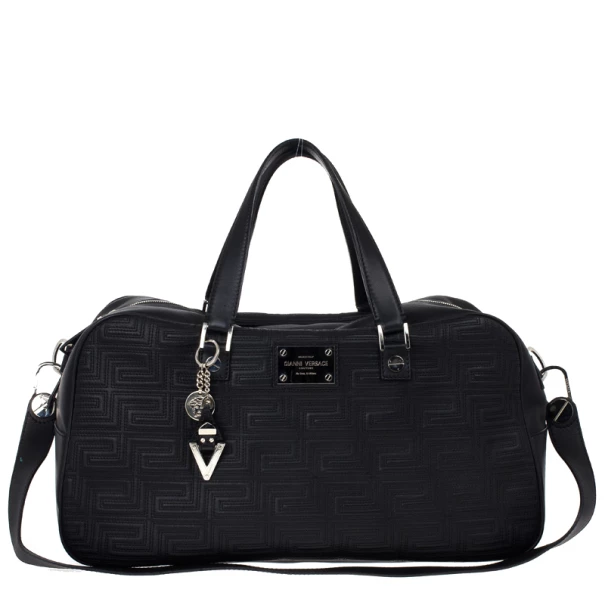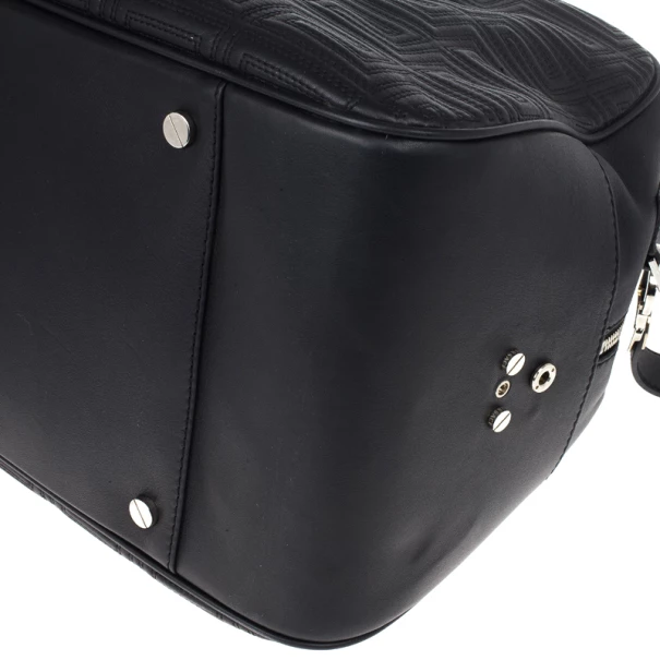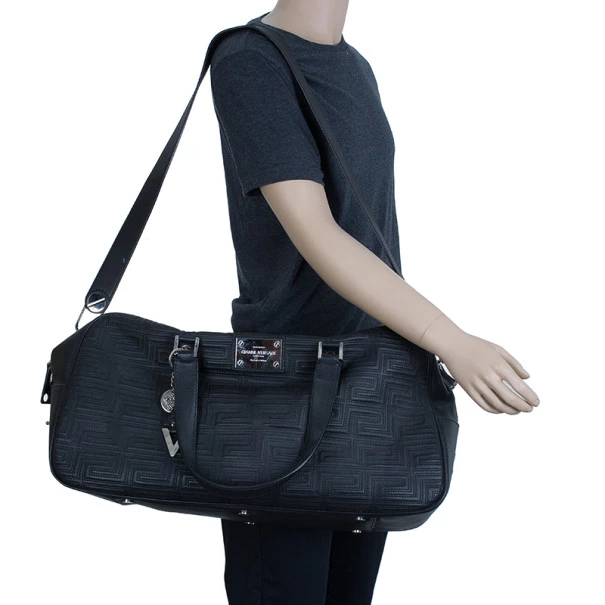 Look dapper even while you travel with this Versace luggage bag from the Gianni Versace line. Its exterior is embossed with Versace’s Couture motif, and its big design gives it a masculine look. It features a shoulder strap as well as a handle, making it versatile and convenient to carry. The silver-tone hardware on the monogrammed plaque, oversized studs, and Medusa charm add a dashing shine to the bag. The interior, lined whit cream textile, provides ample space to fit all your travelling essentials.Original Retail Price: US $2,663