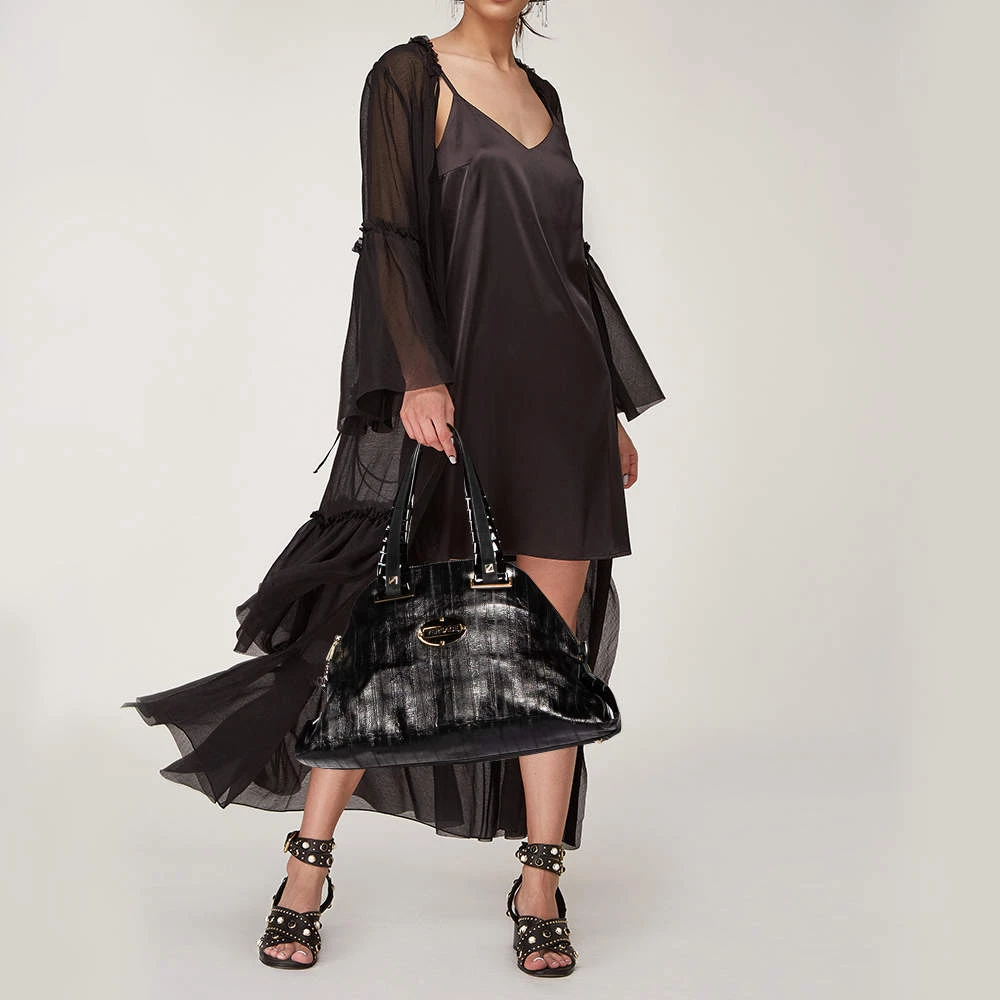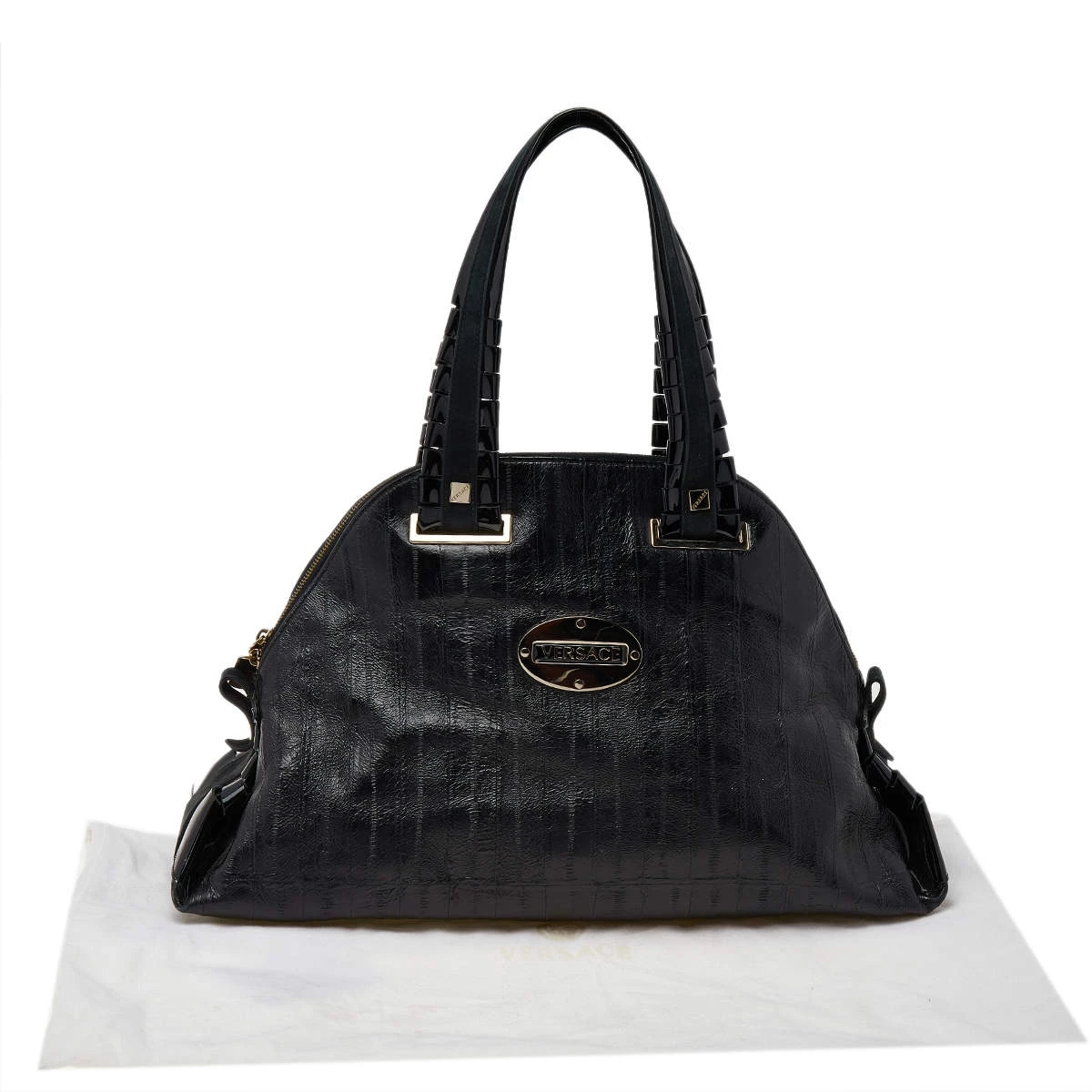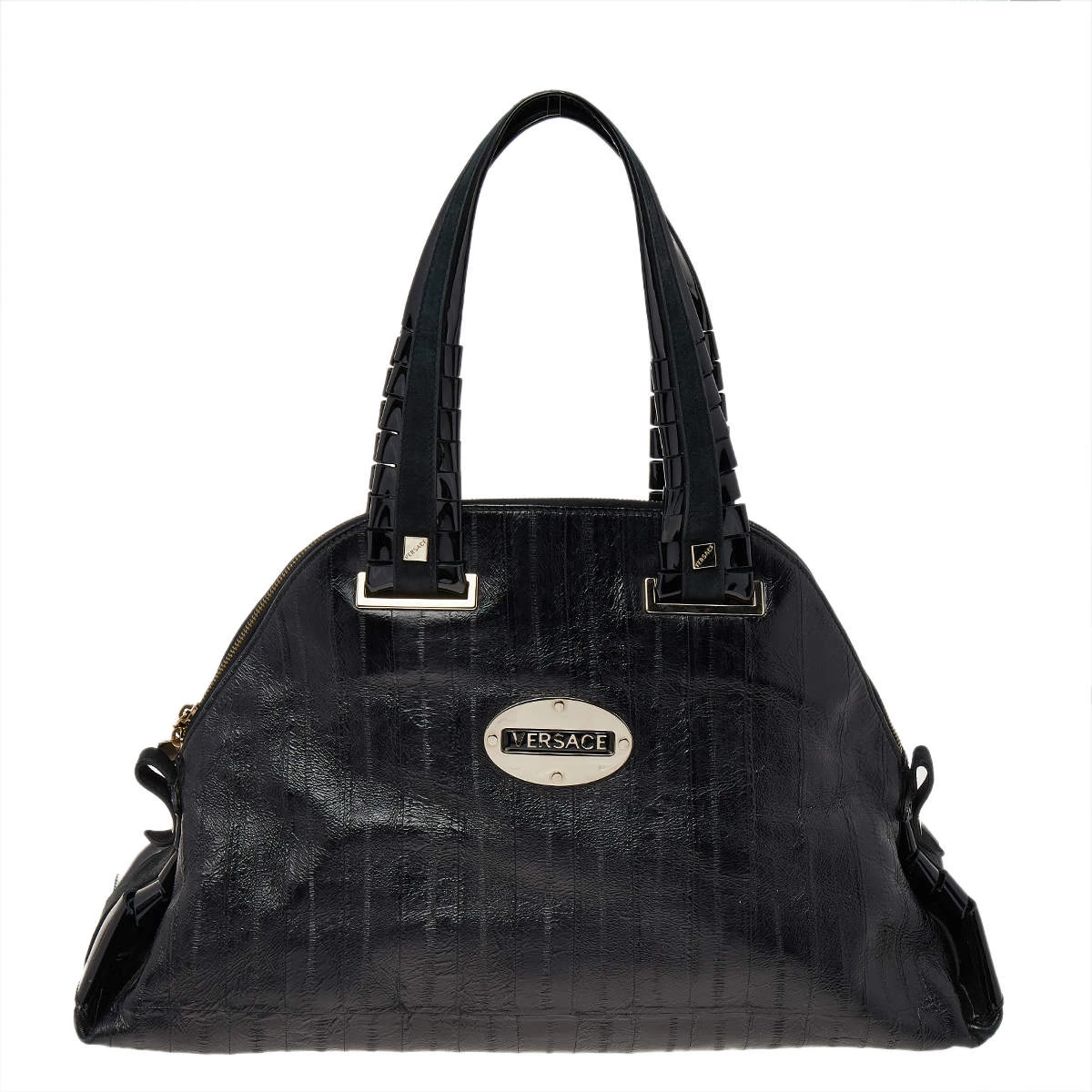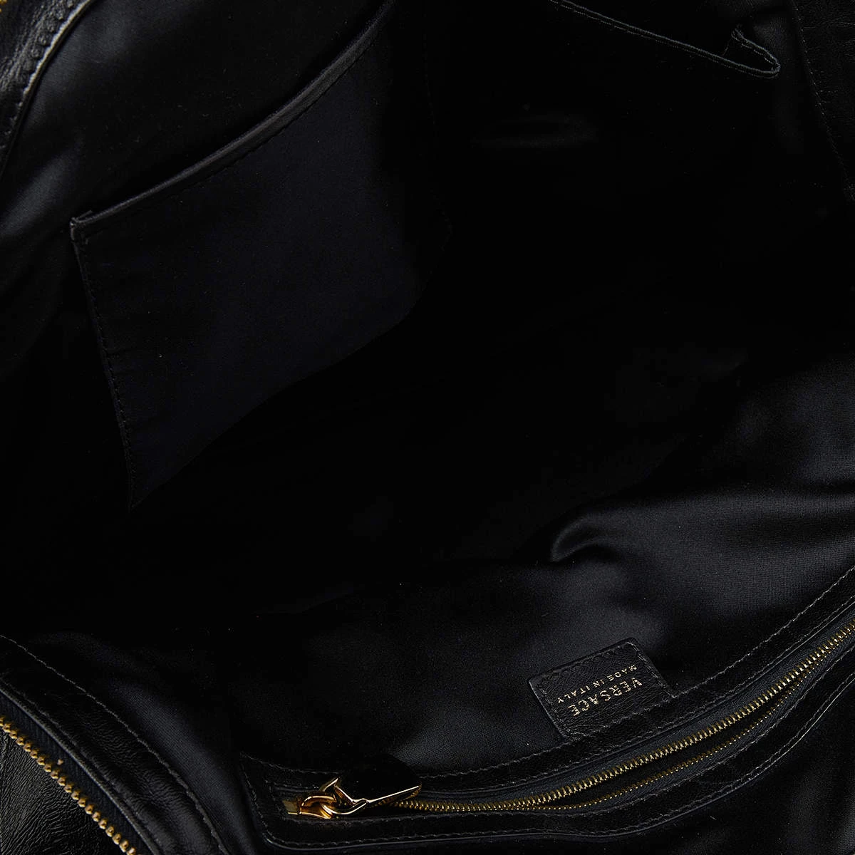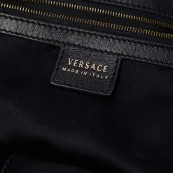 Designed from leather, this Versace satchel in black will complement your everyday look. It features two flat handles, the brand plaque at the front, metal studs to protect the base, and a spacious satin interior.