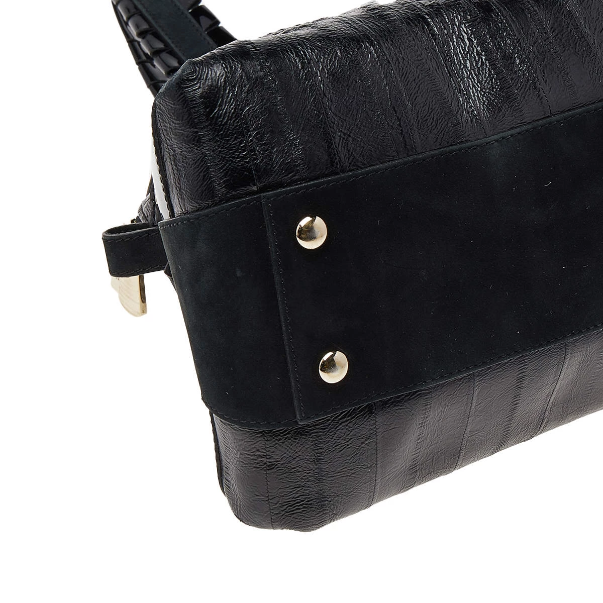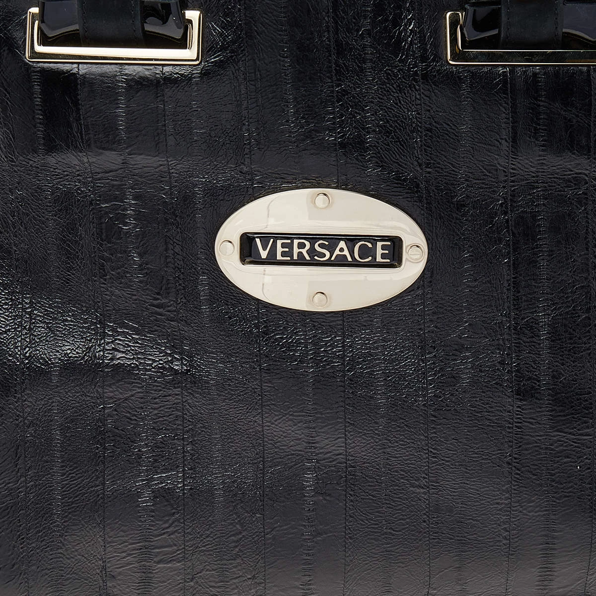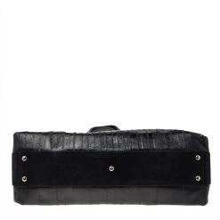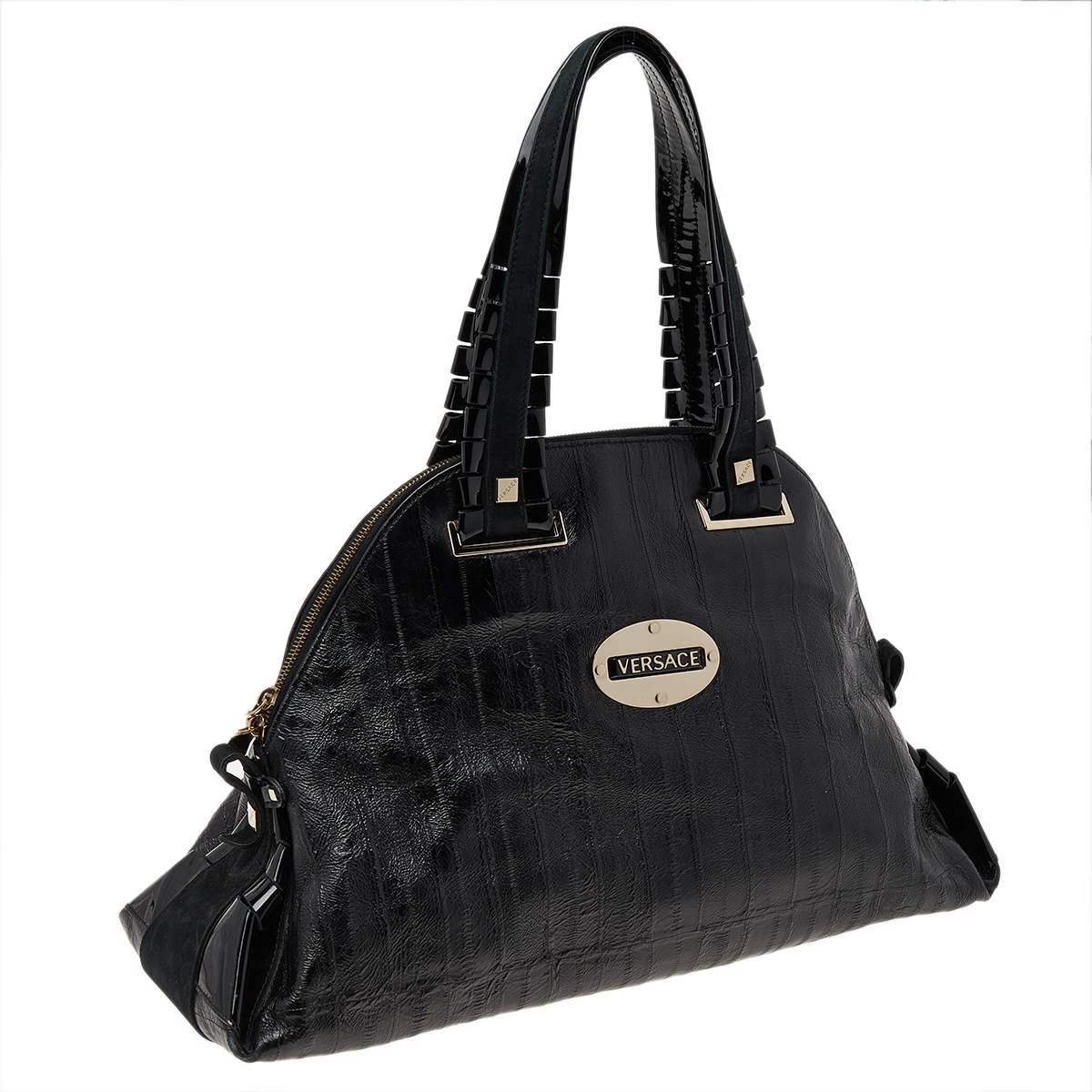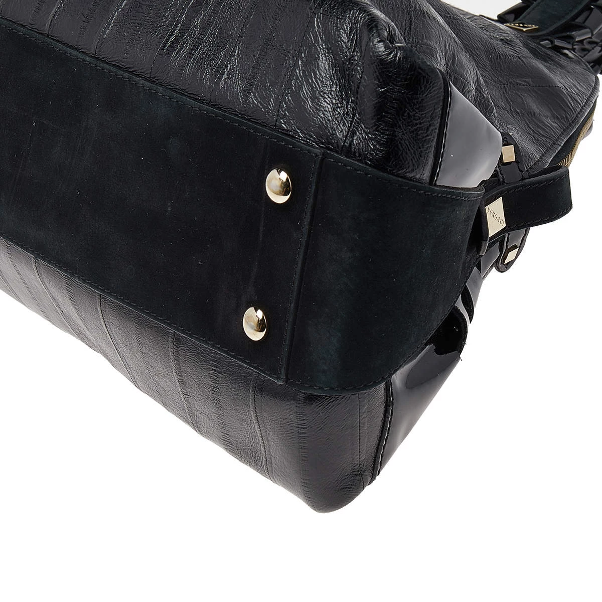 Designed from leather, this Versace satchel in black will complement your everyday look. It features two flat handles, the brand plaque at the front, metal studs to protect the base, and a spacious satin interior.