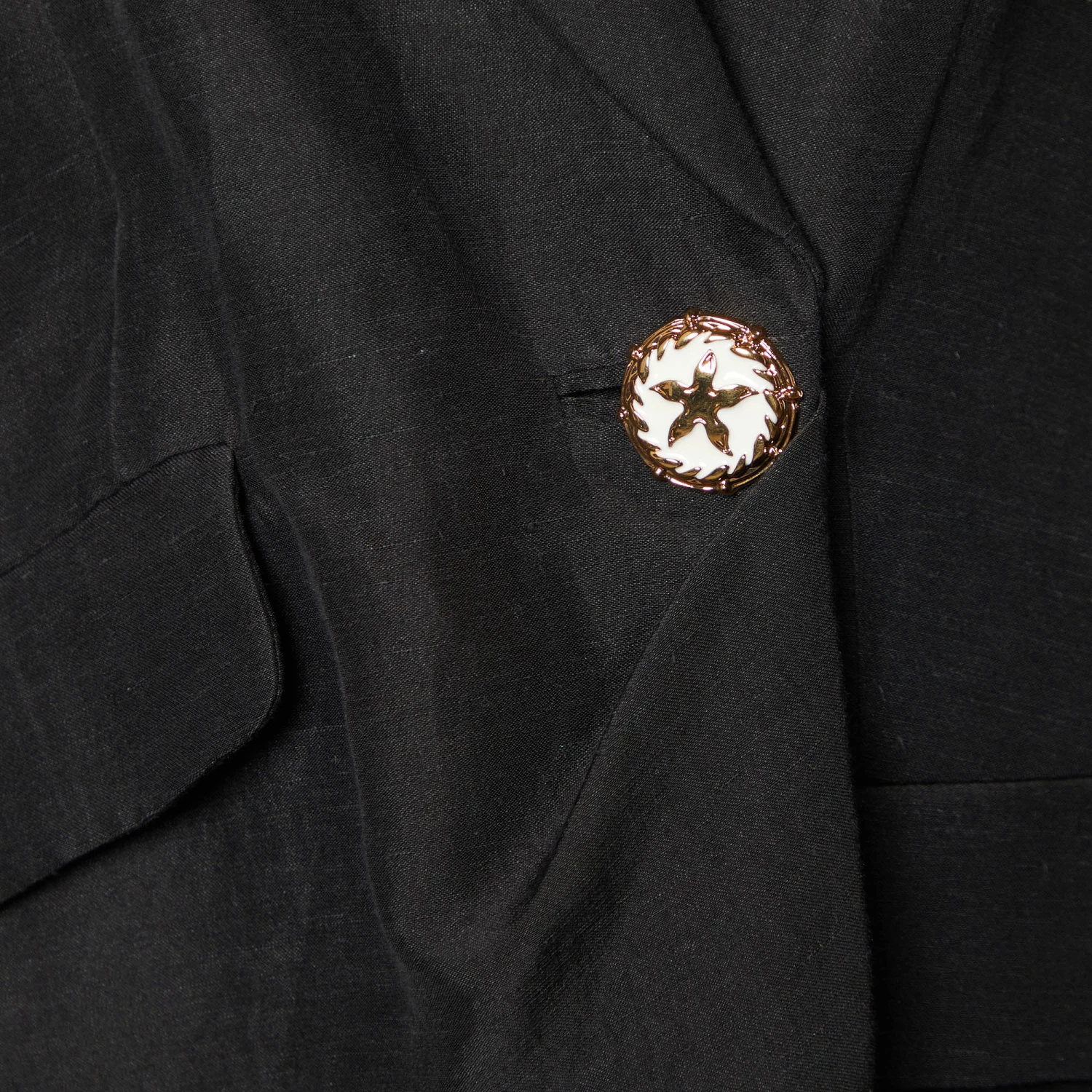 Lend a sharp, fashionable finish to your look with this Versace women’s blazer. Tailored carefully using linen blend fabric, the black blazer is added with a single front button, flap pocket detailing, and long sleeves.