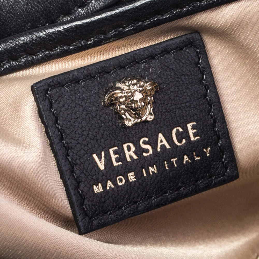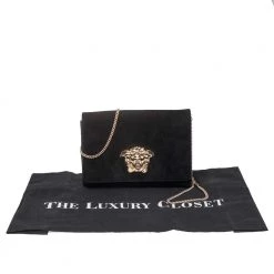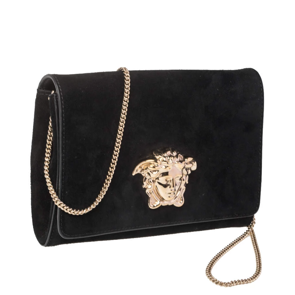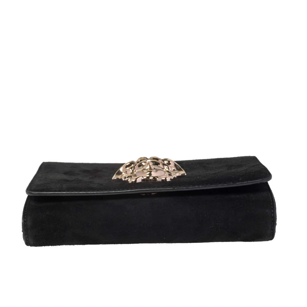 This clutch from Versace is designed in black suede. It brings a Medusa-adorned flap to secure the interior which is lined with satin and leather. It comes held by a gold-tone chain and is perfect for evenings.