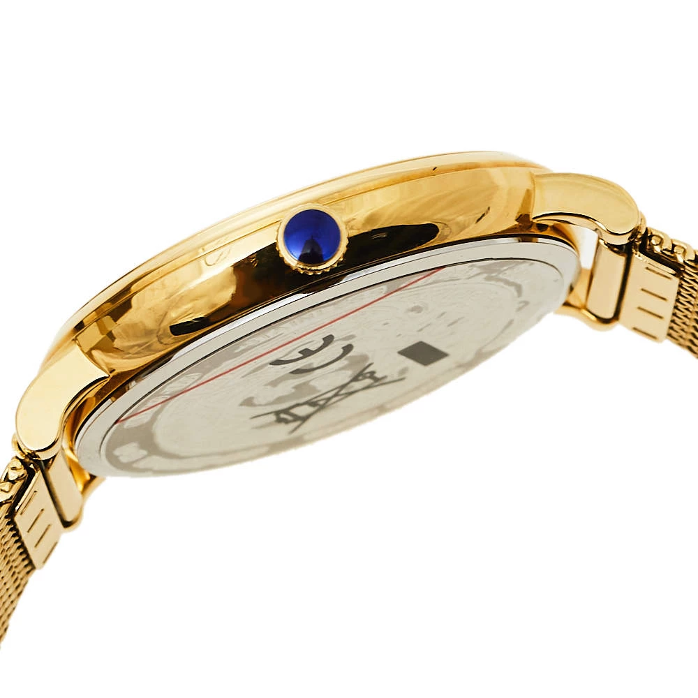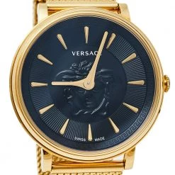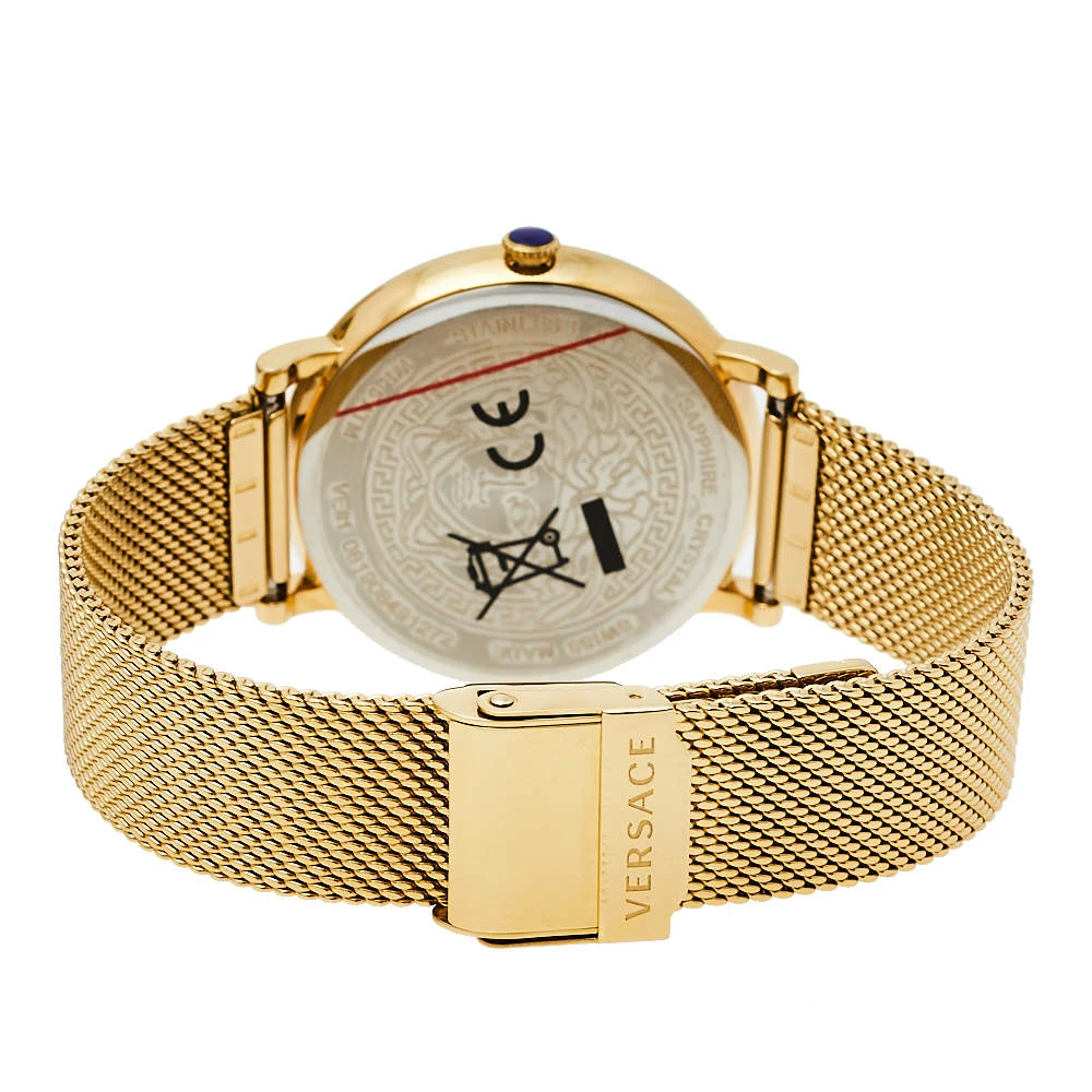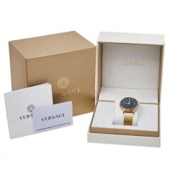 This Versace watch is set in a bold design. Constructed using gold-toned metal, this watch features a matching stainless steel link bracelet and a black dial. The round dial features index hour markers, the Medusa motif, and two hands. The watch is finished with a smooth bezel and 50 meters water resistance level.