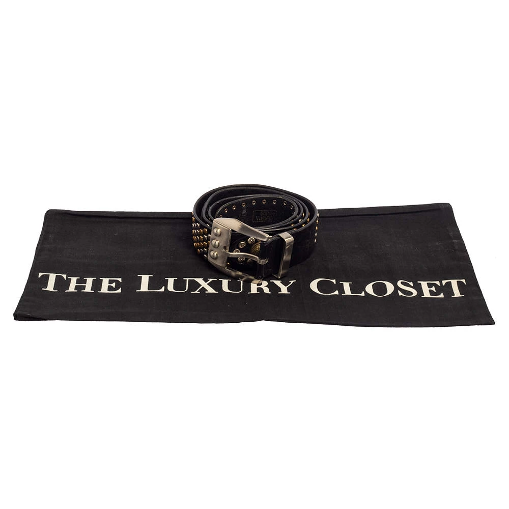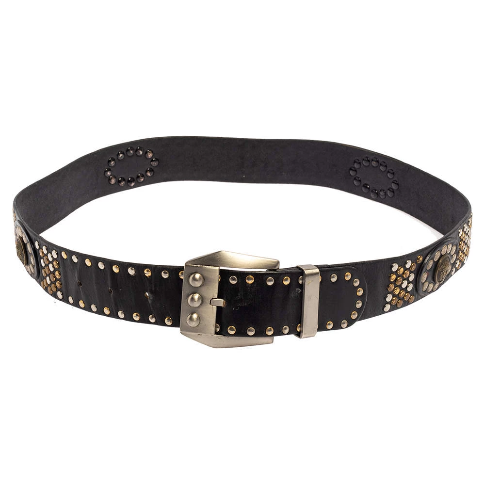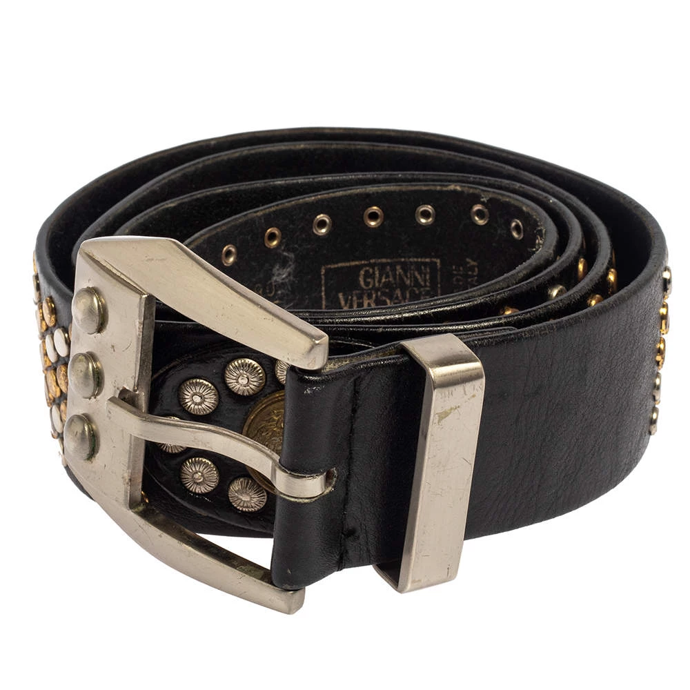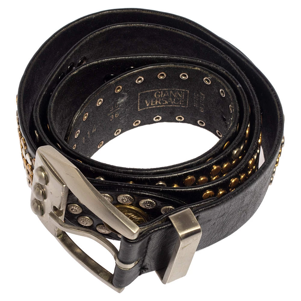 A statement designer belt for men by Versace. The belt is made from leather and elevated into a striking design by using studs in varied tones and the signature Medusa motif. It is sized to comfortably fit your waist.