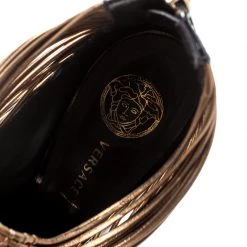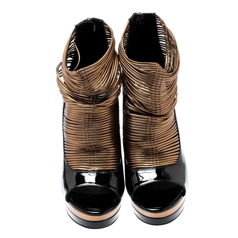 Versace introduces this gorgeous pair of ankle booties, crafted with patent leather to establish a high-end diva look. These peep-toe platform booties feature 14.5cm heels, front cage design in metallic dull gold leather, and zippers on the counters.