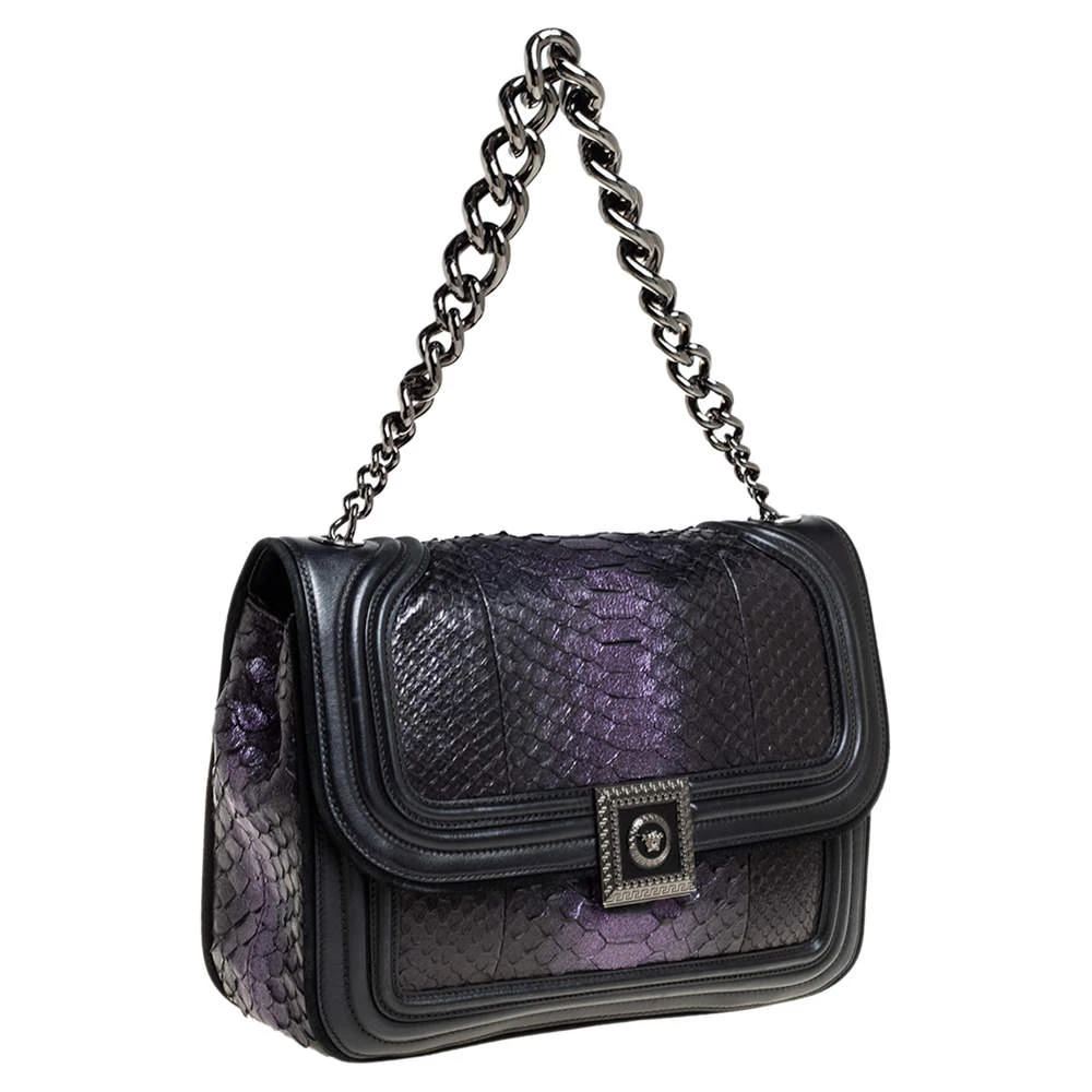 Make a striking appearance with this fashionable shoulder bag by Versace. This elegant creation is at once a fashion statement as well as a rational necessity. It is crafted from leather, python leather & suede and is adorned with a gunmetal-tone signature Medusa motif. Lined with satin, it has a spacious interior where you can stow your basics. This pretty piece is complete with a chainlink handle. (NOTE: FOR UAE CUSTOMERS ONLY)