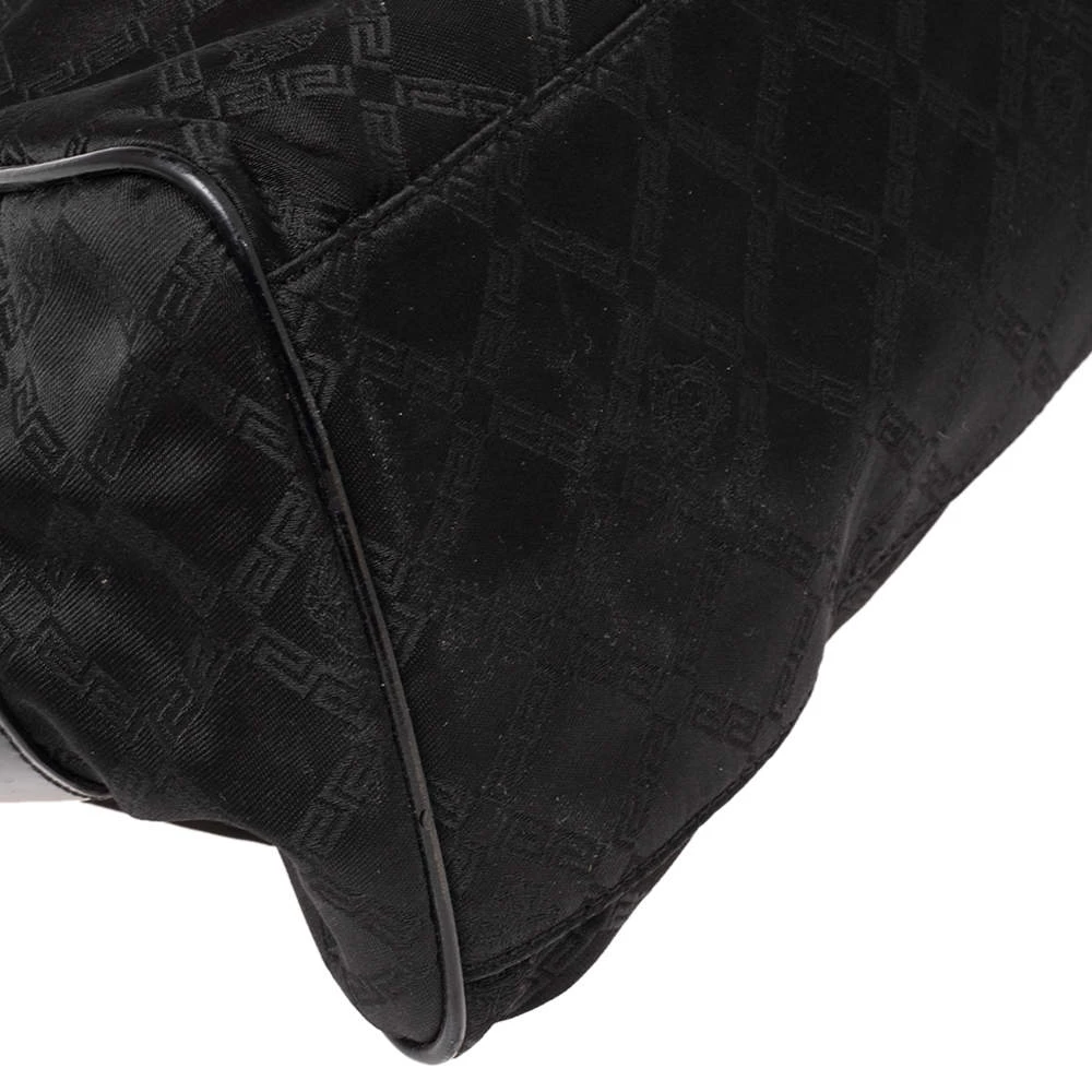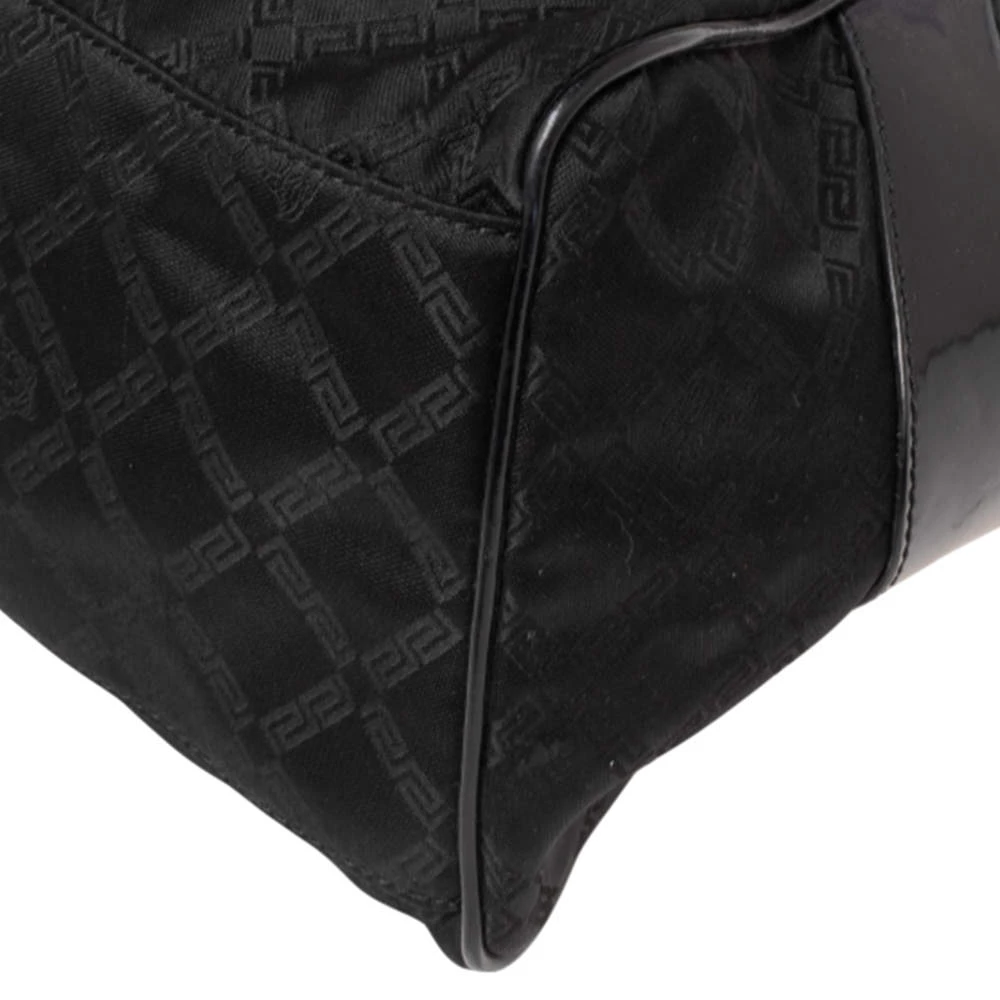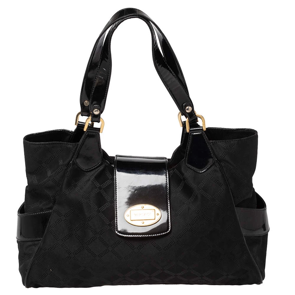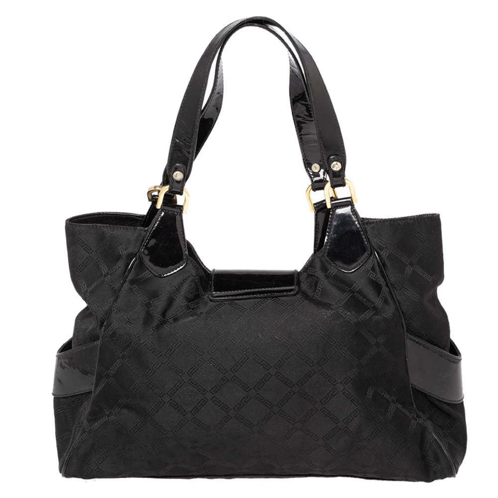 Made from monogram nylon and patent leather, this Versace tote brings a spacious size and a refined appeal. It features two handles, gold-tone hardware, exterior pockets, and a fabric-lined interior.