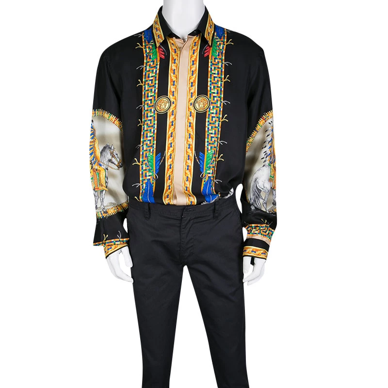 Exuding a vintage feel, this Versace shirt flaunts a native American print that accentuates the black base. The shirt has a classic collar and buttoned closure. Crafted with silk, wear this shirt in a contemporary style with loosely-tailored pants and loafers.