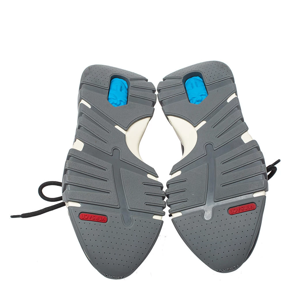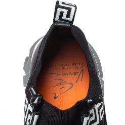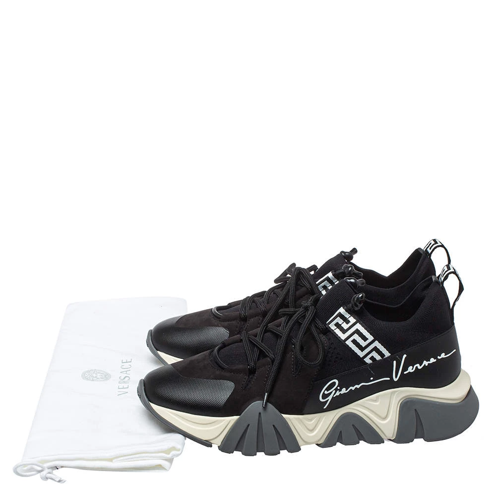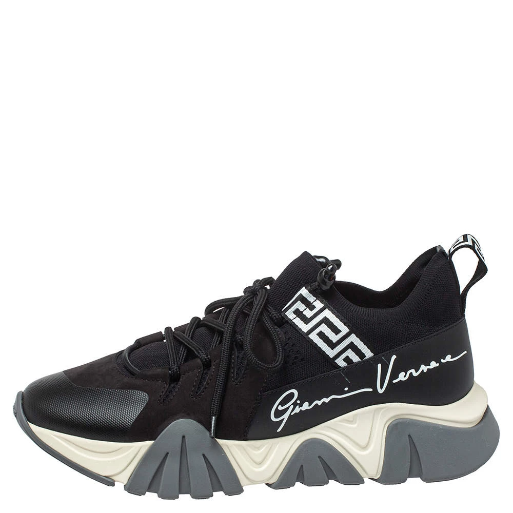 Brand details merged with a statement silhouette bring out the distinct appeal of this Versace Squalo low-top sneaker. The sneakers are formed using knit fabric and leather, secured with lace-ups, and elevated on chunky soles.