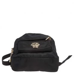 This stylish backpack from Versace is crafted from nylon and it features leather trims as well as the Medusa motif on the front zip pocket. It features a nylon-lined interior, top-zip closure, and shoulder straps. The simple design makes it ideal for everyday use.