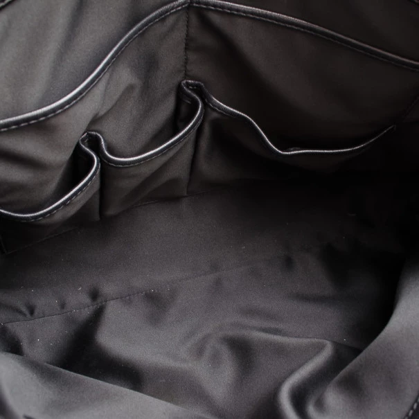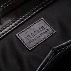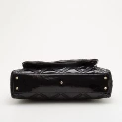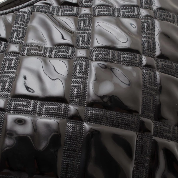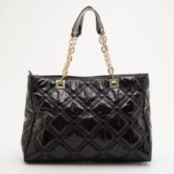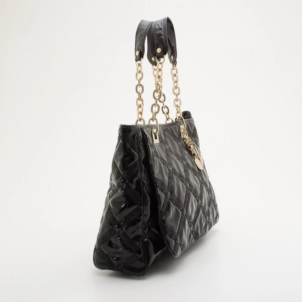 You’ll love carrying this patent leather bag by Versace! Made from black quilted patent leather with purple trim, it features gold tone hardware, a chain link shoulder strap and a dangling charm. The canvas lined roomy interior has five patch pockets. Original Retail Price: US $1,800