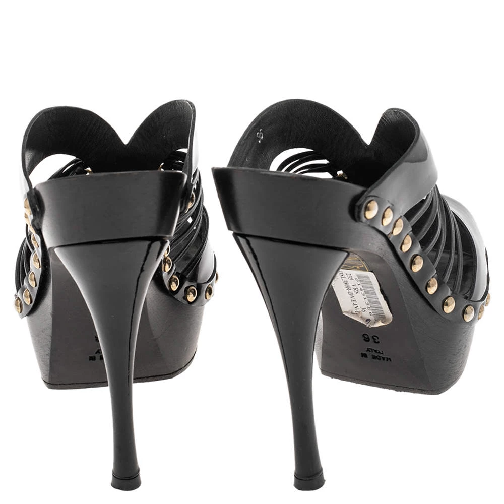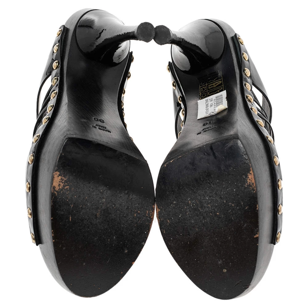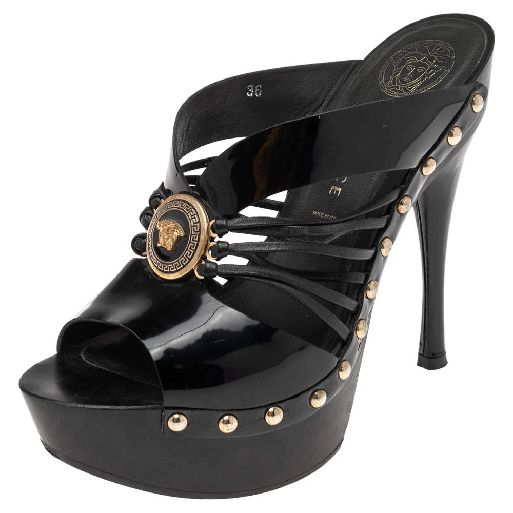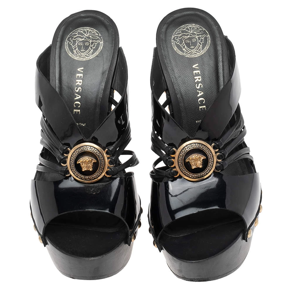 These glamorous sandals from Versace will make sure you look absolutely divine. They are finely crafted from patent leather in black and feature an open-toe silhouette with a strappy layout. They are detailed with the signature Medusa motif at the center and come equipped with comfortable leather-lined insoles and 11 cm heels supported by platforms.