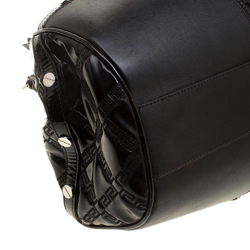 A wardrobe essential patent leather bag that will complete your attire. The attractiveness lies in its dreamy black color which will evenly complement all your dresses. This sleek piece has interiors stitched with satin for precision. Look ornate and chic in this Versace creation.