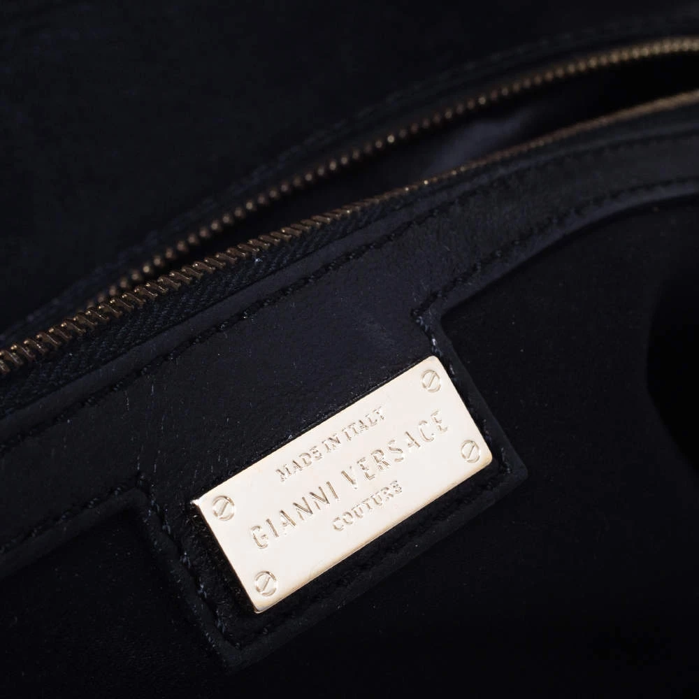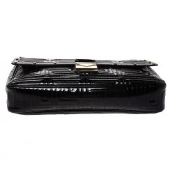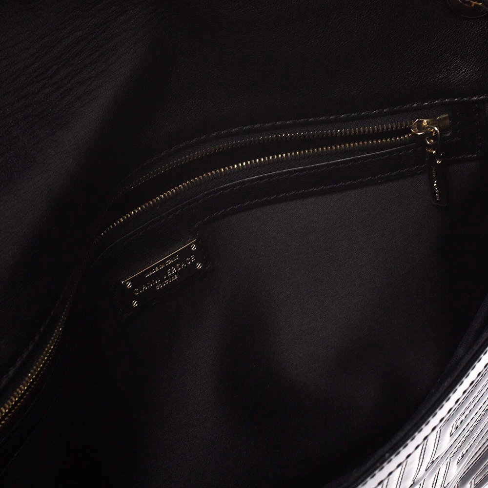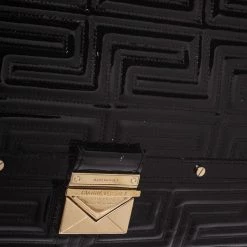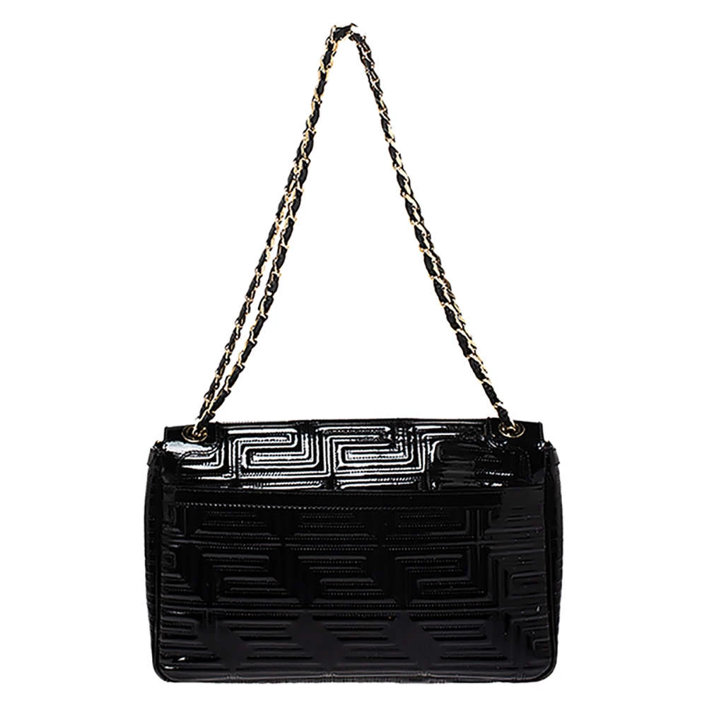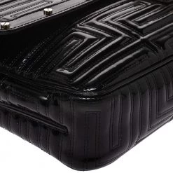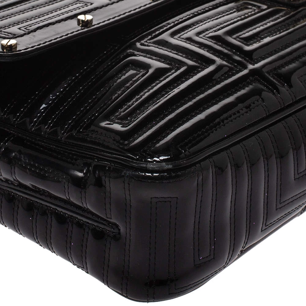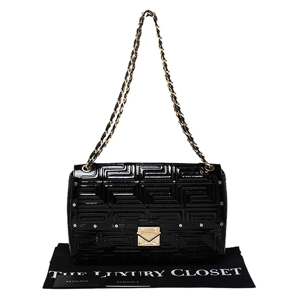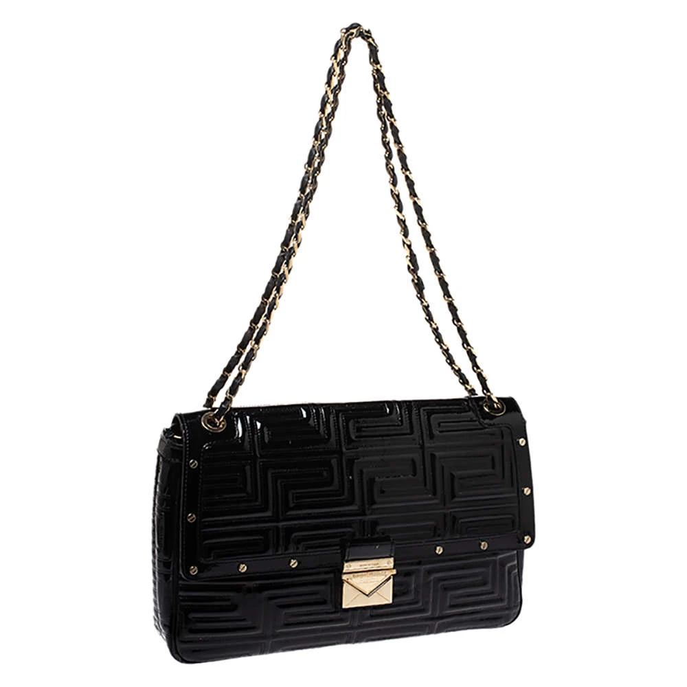 This majestic handbag from Versace is all that you need to instantly raise your look. This bag is crafted in Italy and made from glossy patent leather. It comes in black and features a quilted exterior with stud detailing. It has a front flap that opens to reveal a satin0lined interior with a zip pocket, brand plaque and enough space for essentials. It is finished with gold-tone hardware and chain-link straps.
