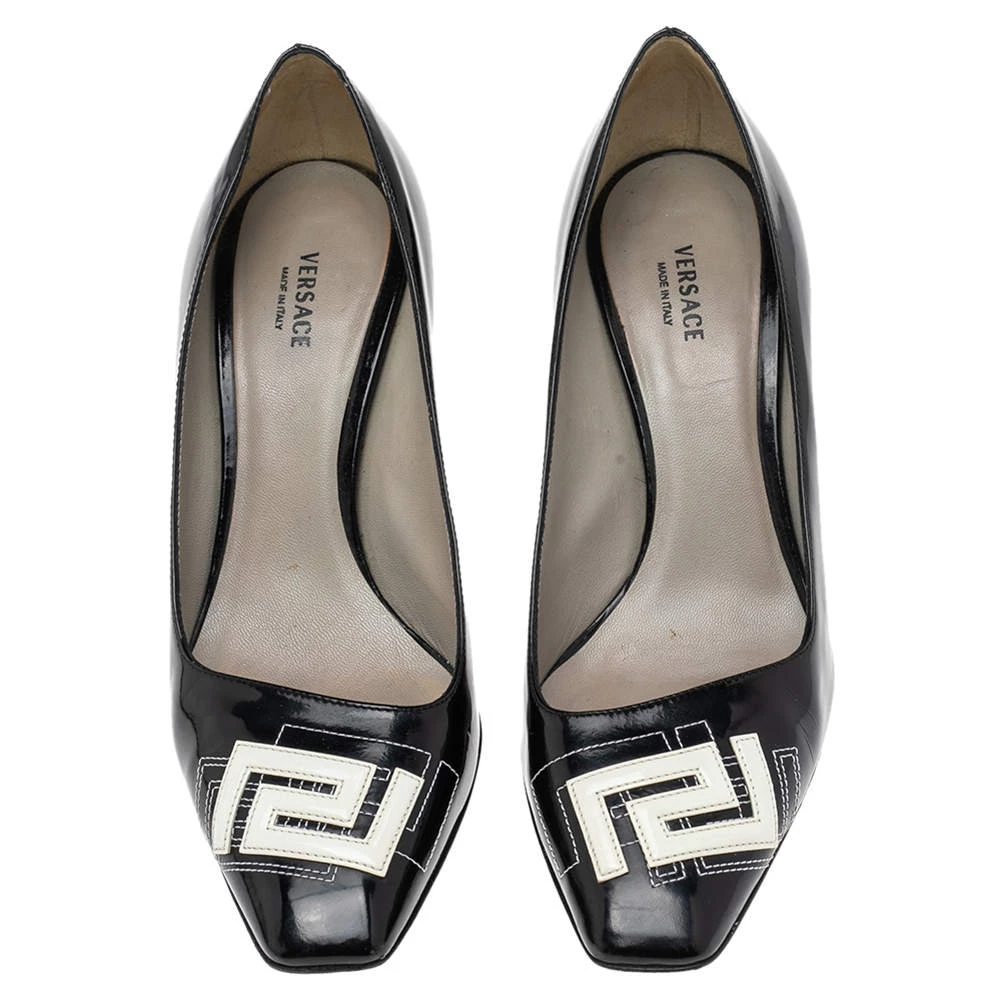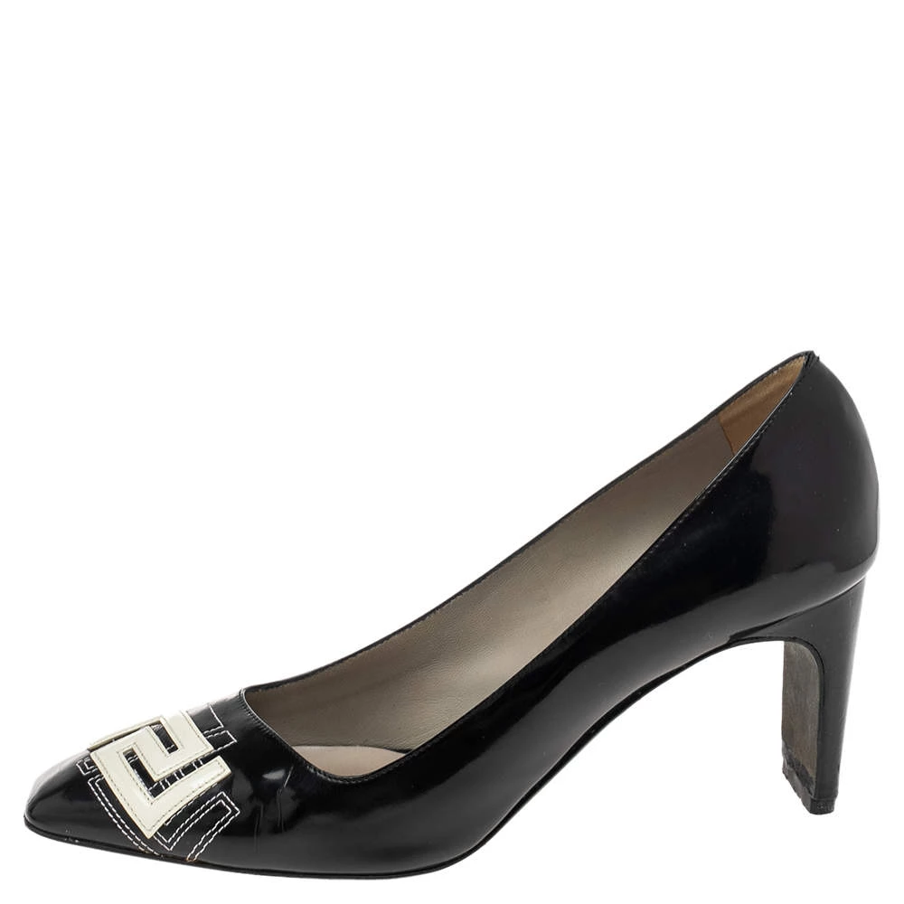 The House of Versace curates luxurious commodities like these pumps to offer your ensemble with endless style and poise. These pumps are made using black patent leather with a stitched logo detail adorning the square toes. They are completed with block heels.