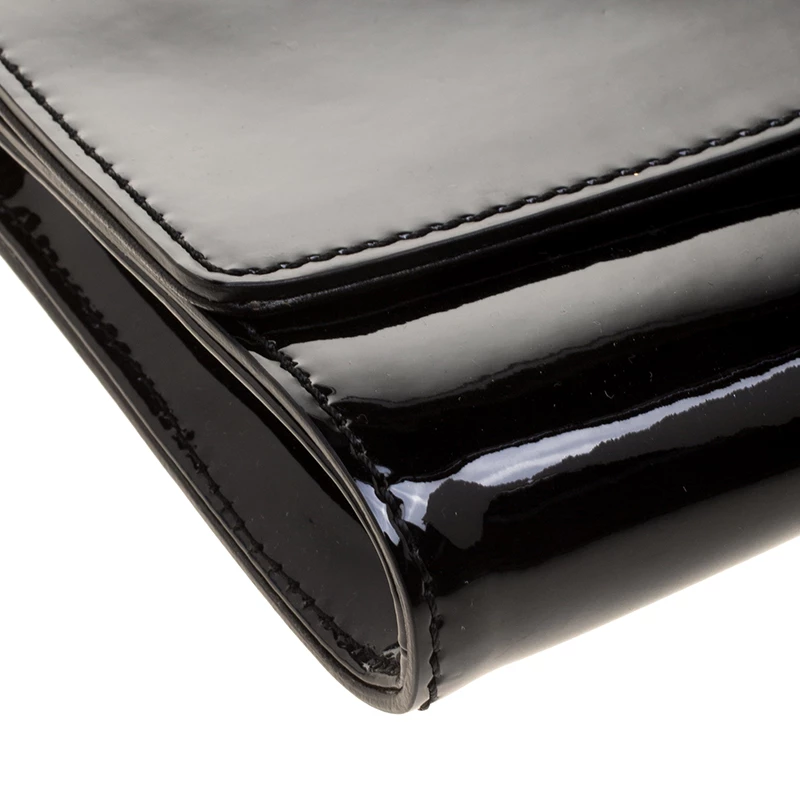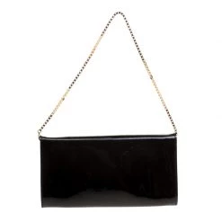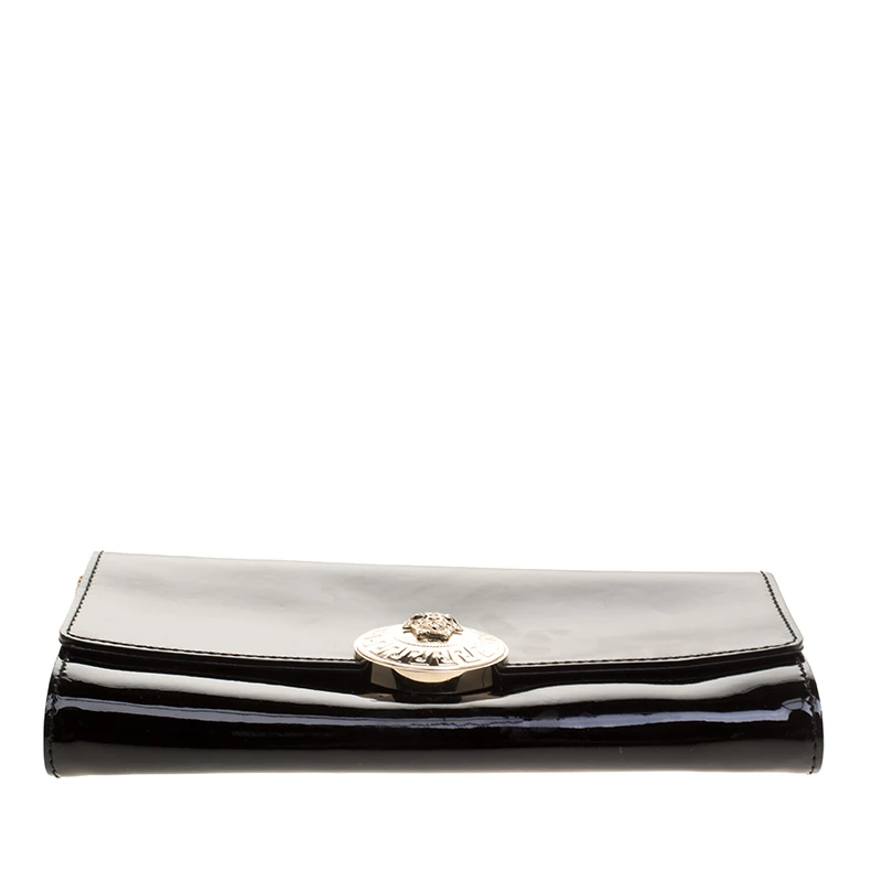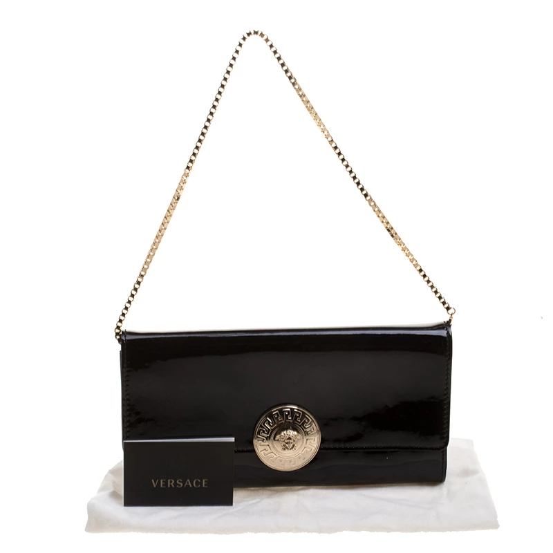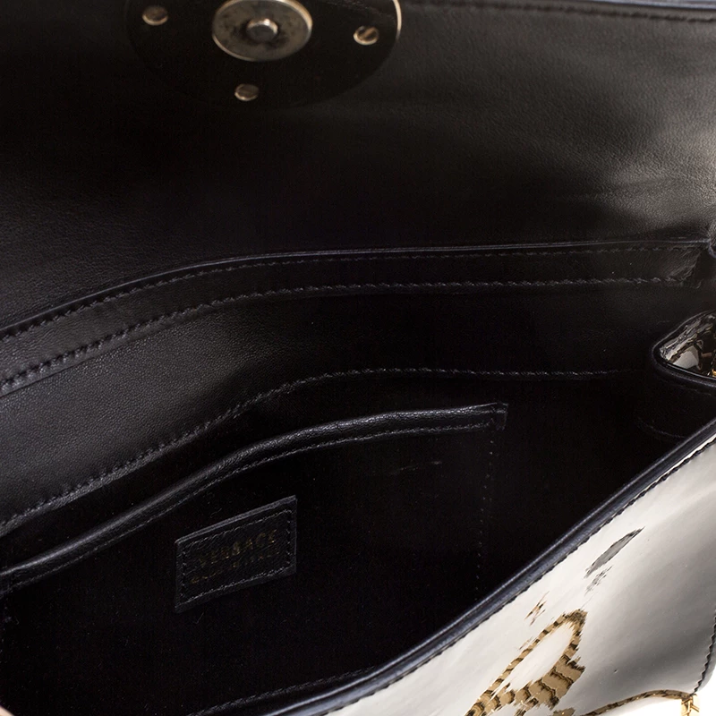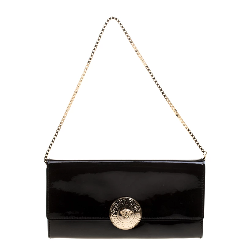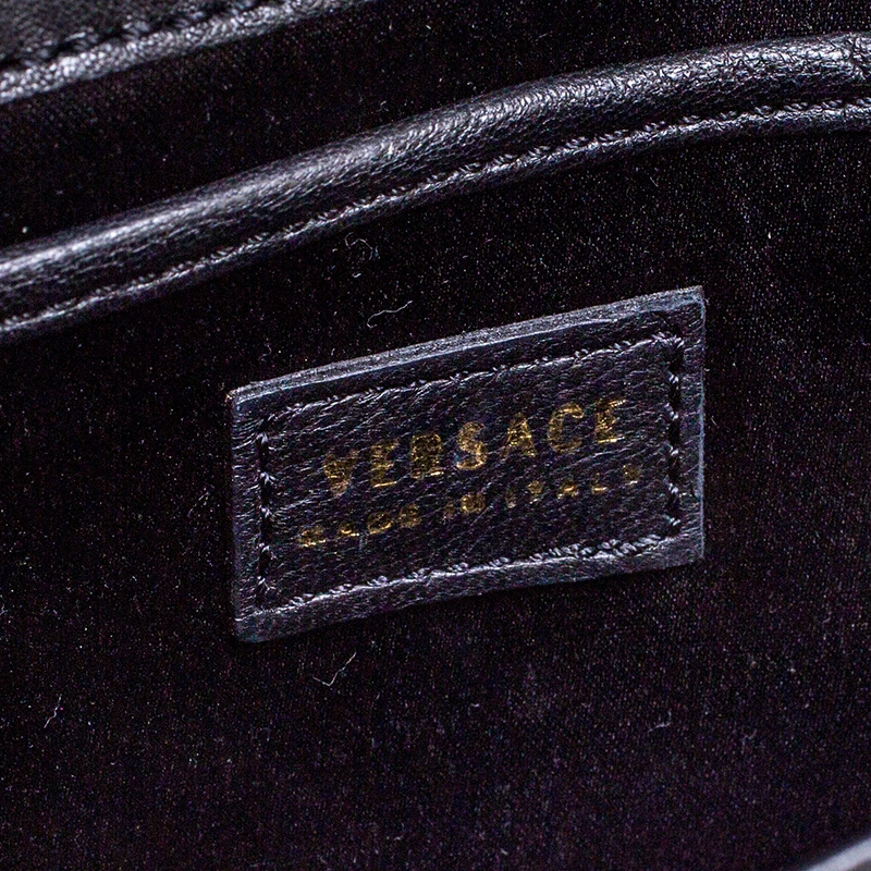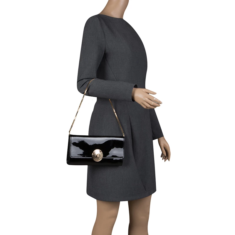 Pick this covetable Versace clutch and make a valuable addition to your closet. The Medusa logo in gold-tone hardware sitting on the glossy black base is the winning feature of this petite bag. Equipped with a flap and a chain shoulder strap, it has a leather and satin-lined interior with a cell phone pocket.
