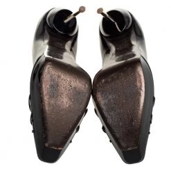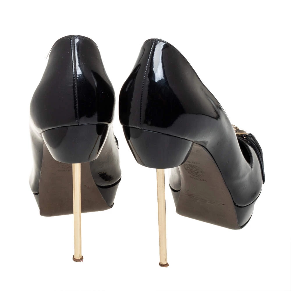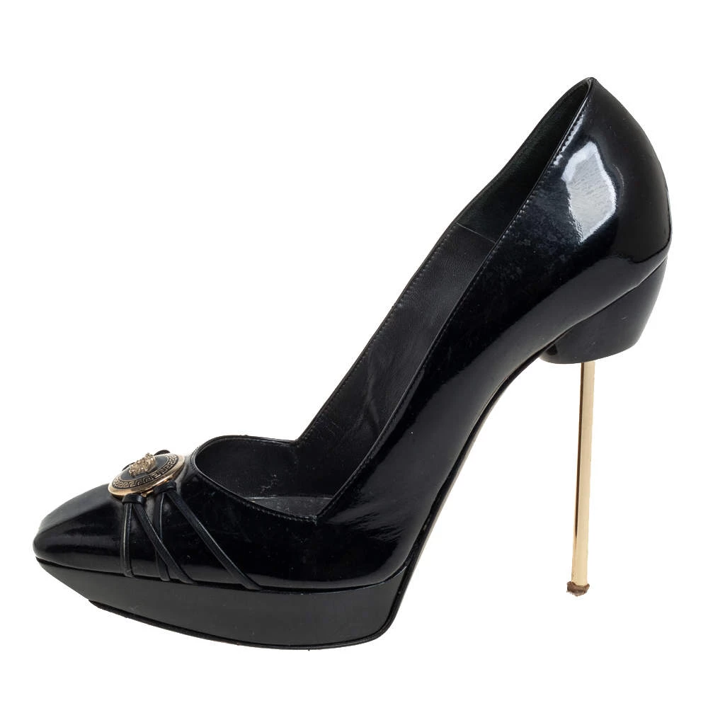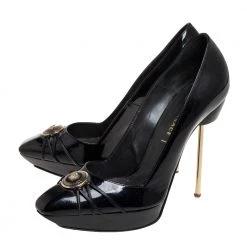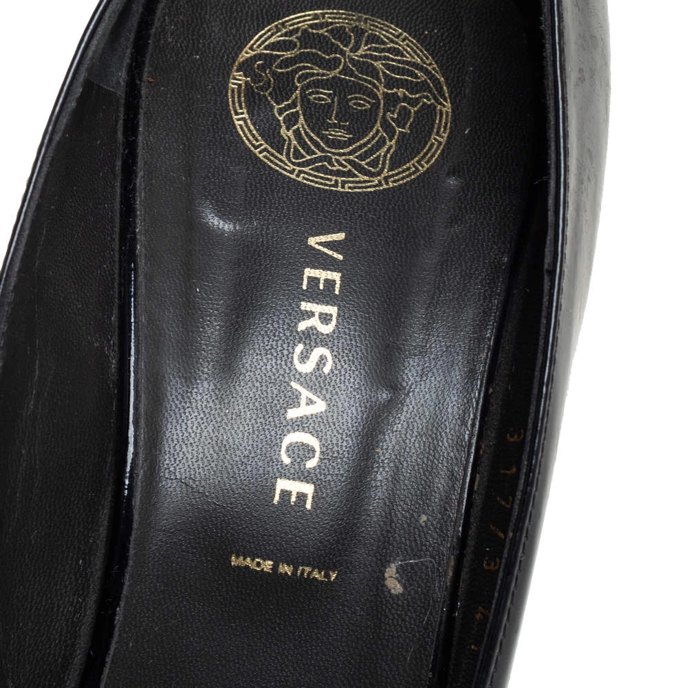 Designed to perfection, these pointed-toe pumps are from the famous luxury house of Versace. They are covered in patent leather, detailed with the Medusa logo and balanced on 9.5 cm heels. Feel your best every time you slip into these black pumps.
