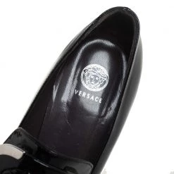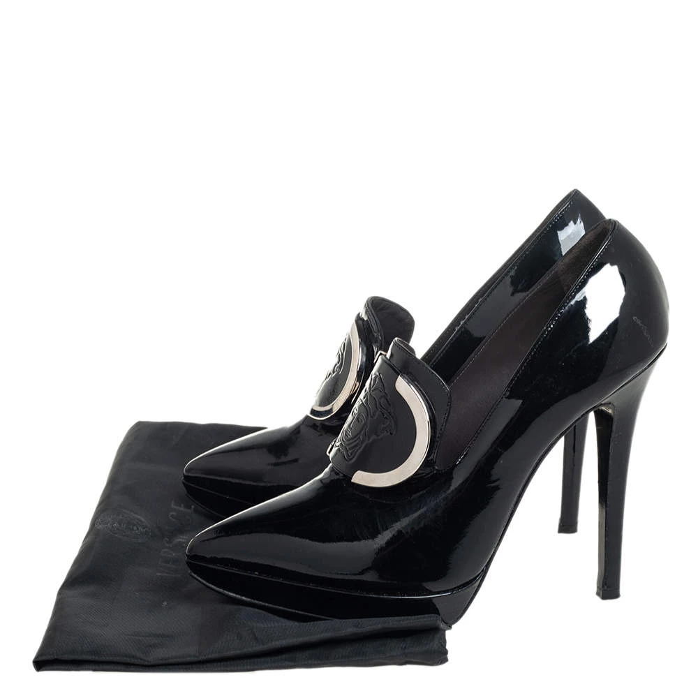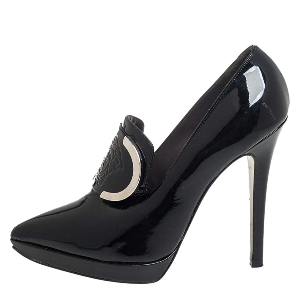 Crafted from patent leather, these loafer pumps are ideal for any event. This Versace pair comes in black and features a block heel of 12 cm. These Medusa platform heels are designed with gold-tone detailing on the vamps. This will be a great addition to your closet.
