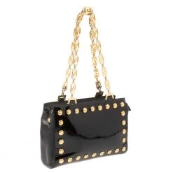 The Medusa shoulder bag by the iconic house of Versace is a statement-making piece. Made from glossy patent leather, it features the iconic Medusa motif in gold-tone on the studs and chain-link shoulder straps. The satin-lined interior is enclosed with a zipper.