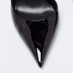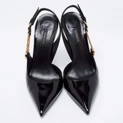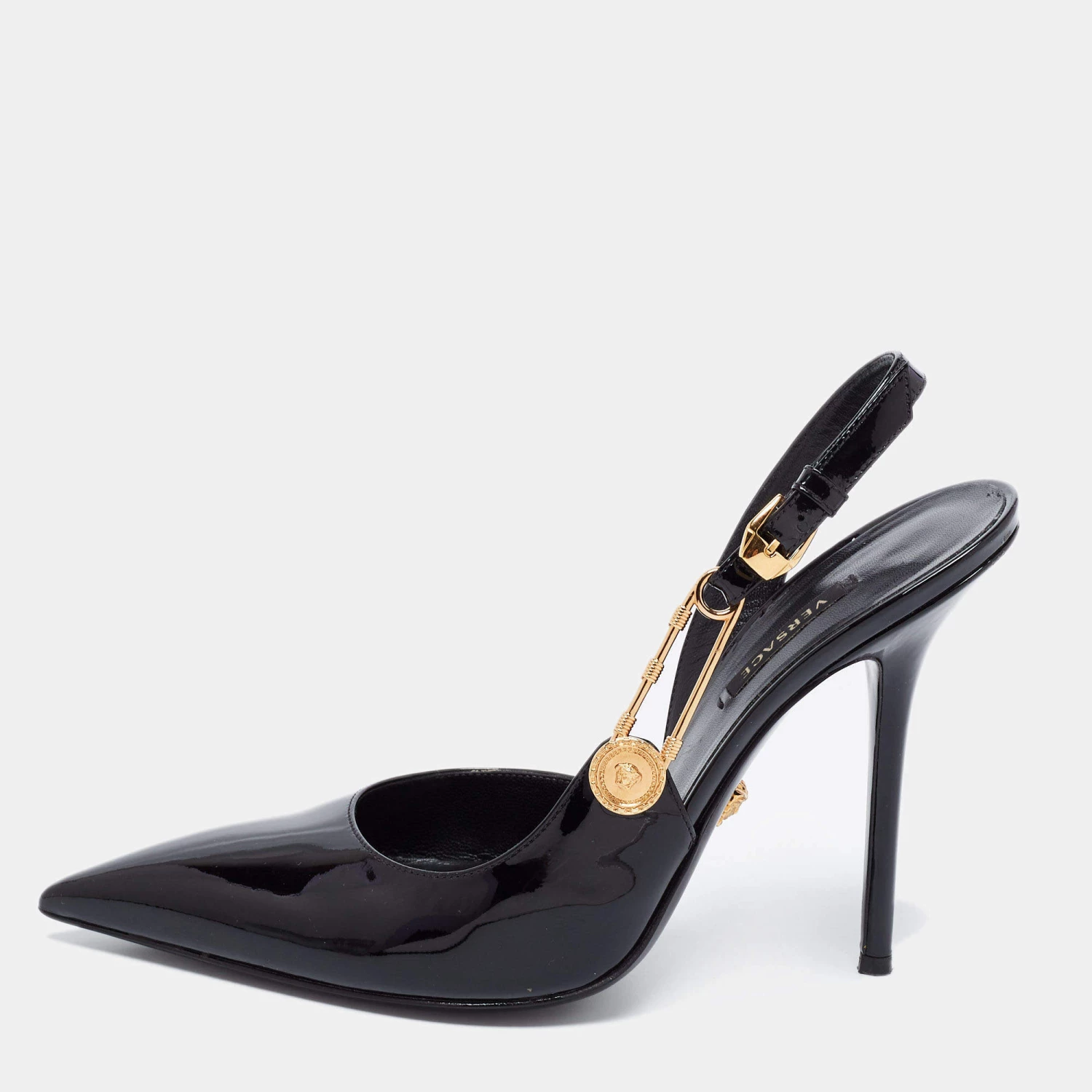 Classy in black, these Versace pumps come crafted from patent leather and feature a sleek pointed-toe silhouette. They have been styled with gold-tone safety pin embellishments along the buckled slingback straps and are equipped with smooth insoles. Elevated on slender 12 cm heels, they are a perfect blend of comfort and high fashion.