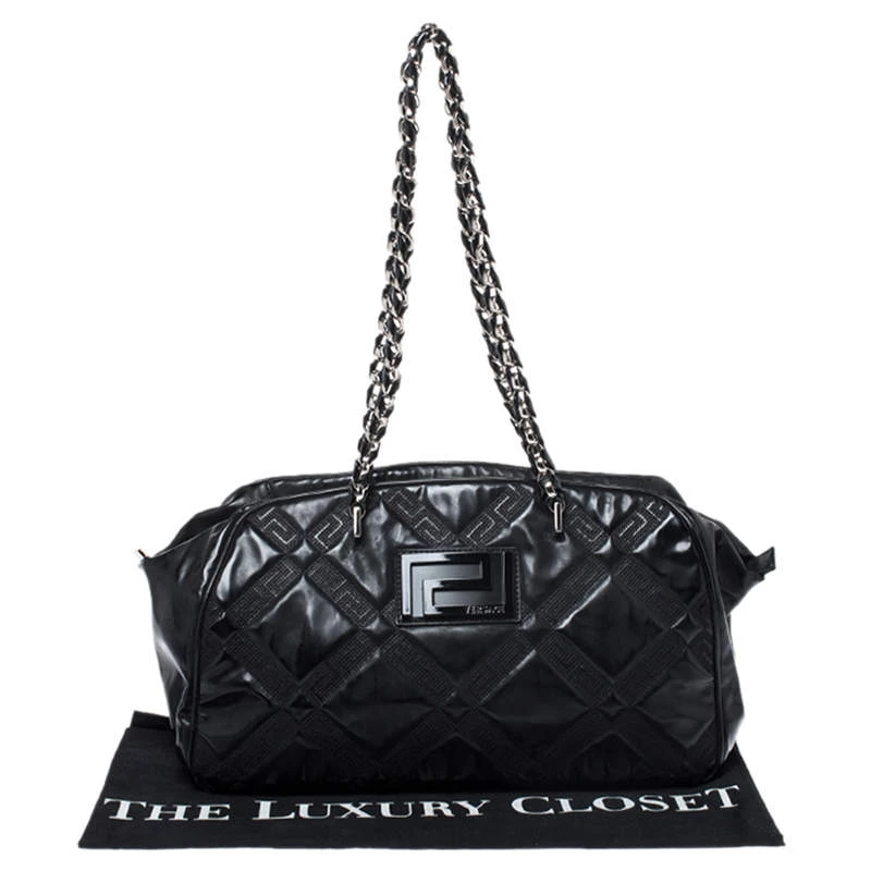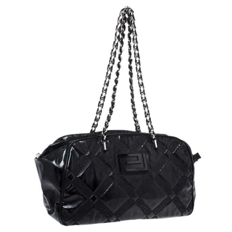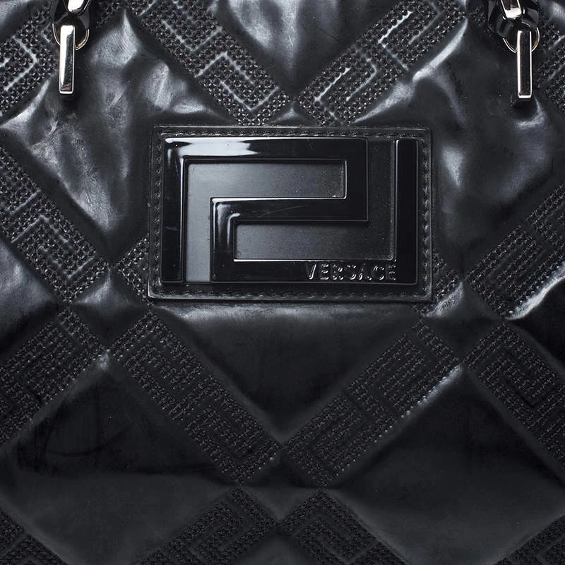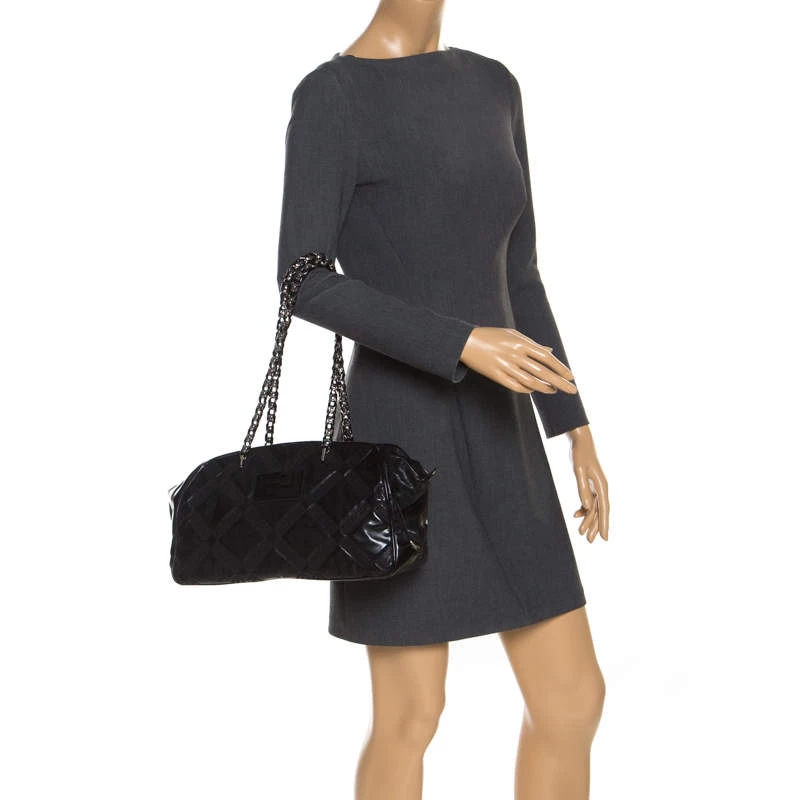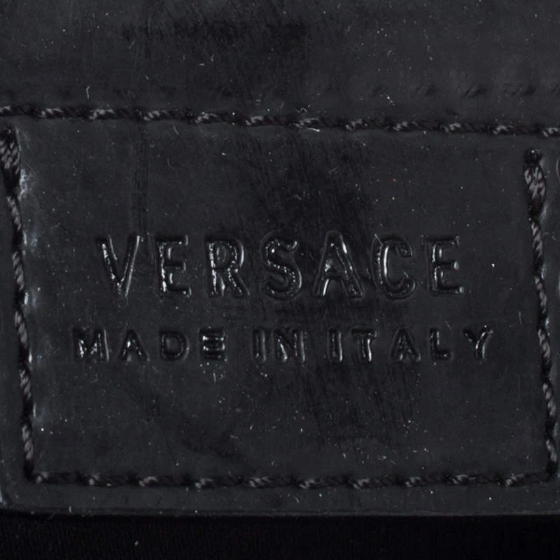 This handbag from Versace lends a signature touch to your dress and elevates its trend quotient. This opulent and multipurpose patent leather handbag would go perfectly for any of your occasions. With an expertly lined satin, this bag can accommodate all your essentials. Accentuate your style by carrying this black bag that looks visually aesthetic.