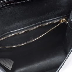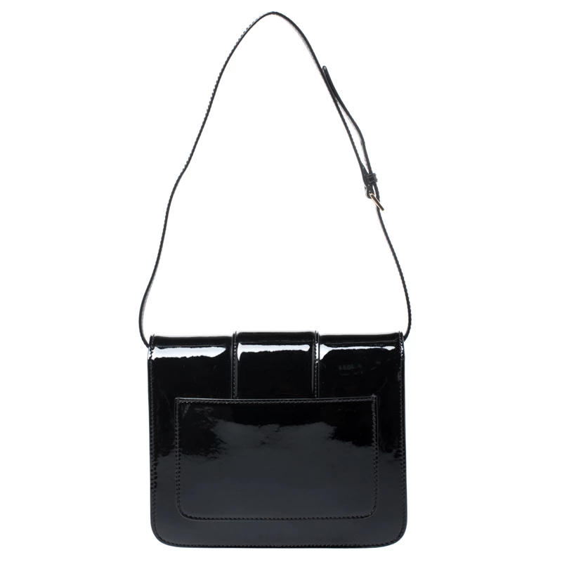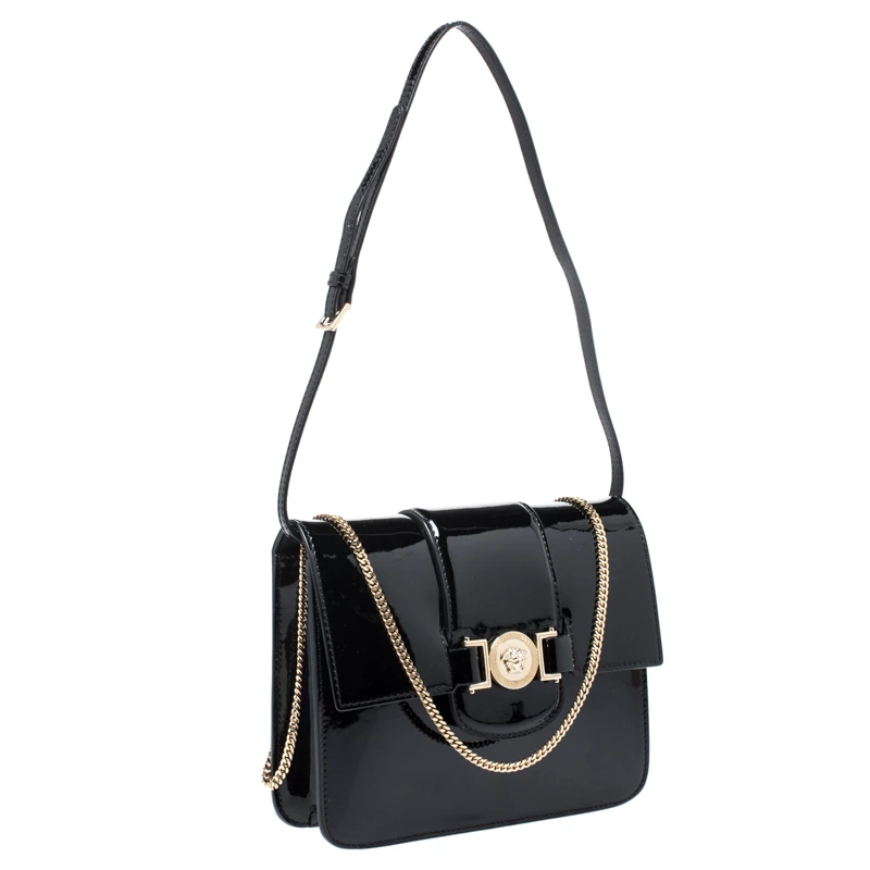 This gorgeous bag by Versace is glossy and glamorous. Crafted in Italy, it is made from quality patent leather and comes in a lovely shade of black. This shoulder bag features the signature Medusa logo on the front flap that opens to reveal a leather interior with a zip pocket and enough space for essentials. It has a chain-link strap and a shoulder strap for convenience. It is finished with gold-tone hardware. Grab this beauty now!
